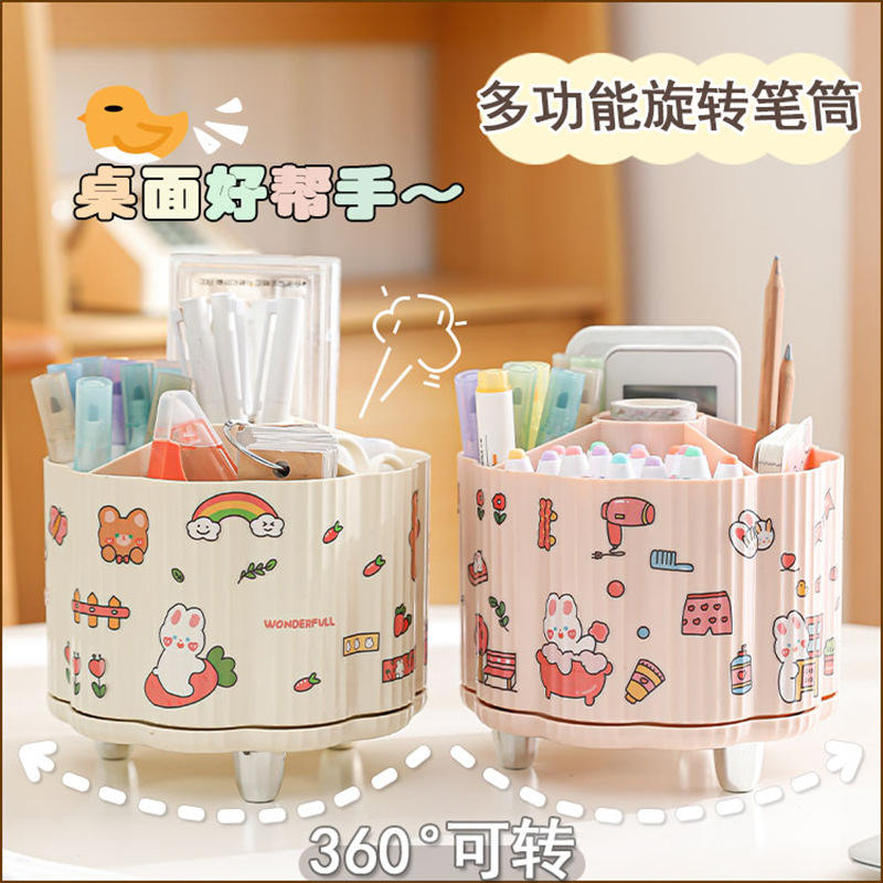 ที่ใส่ปากกาการ์ตูนน่ารัก กล่องเก็บของพลาสติกทรงกลม มีช่องแบ่ง หมุนได้ สำหรับจัดเก็บเครื่องเขียน สีชมพูเบจ สำหรับเด็ก