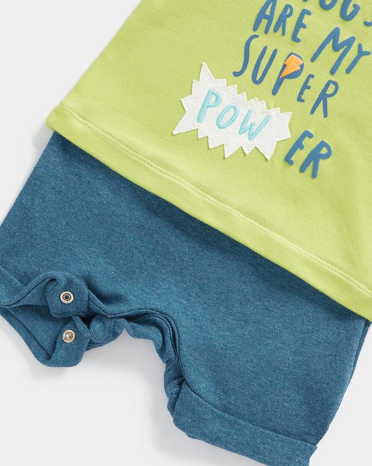 ชุดหมีผ้าฝ้ายน่ารักใส่สบายสำหรับเด็กวัยหัดเดินเสื้อยืดแขนสั้นสีเขียวและกางเกงขาสั้นสีน้ำเงินสำหรับชุดเสื้อผ้าฤดูร้อน