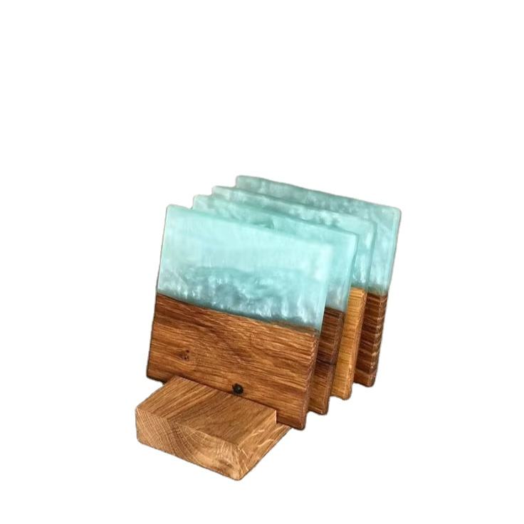 ชุดที่รองแก้วไม้เรซิ่น4ชิ้นพร้อมที่วางไม้ดีไซน์น่ารักไม่ซ้ำใครเลือกสีตัวอย่างถ้วยชาและแผ่นรองแก้วขายส่ง