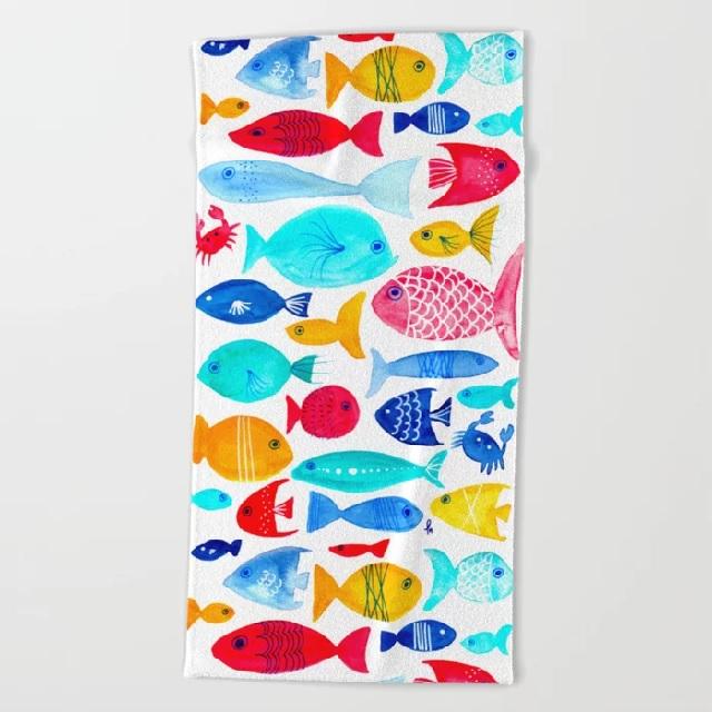 ผ้าขนหนูผ้าฝ้ายออร์แกนิก100% ลายปลาสวยงามน่ารักขนาด70x140ซม. ผ้าขนหนูผ้าฝ้ายแห้งเร็ว450กรัมสำหรับฤดูร้อน