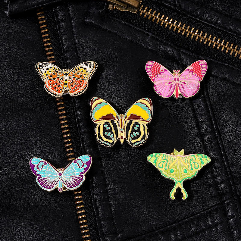 เข็มกลัดโลหะรูปผีเสื้อปีกดอกไม้การ์ตูนน่ารักเคลือบเงาแบบนุ่ม งานฝีมือสั่งทำพิเศษ รูปแมลงติดเสื้อ