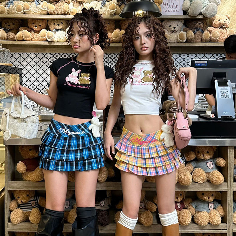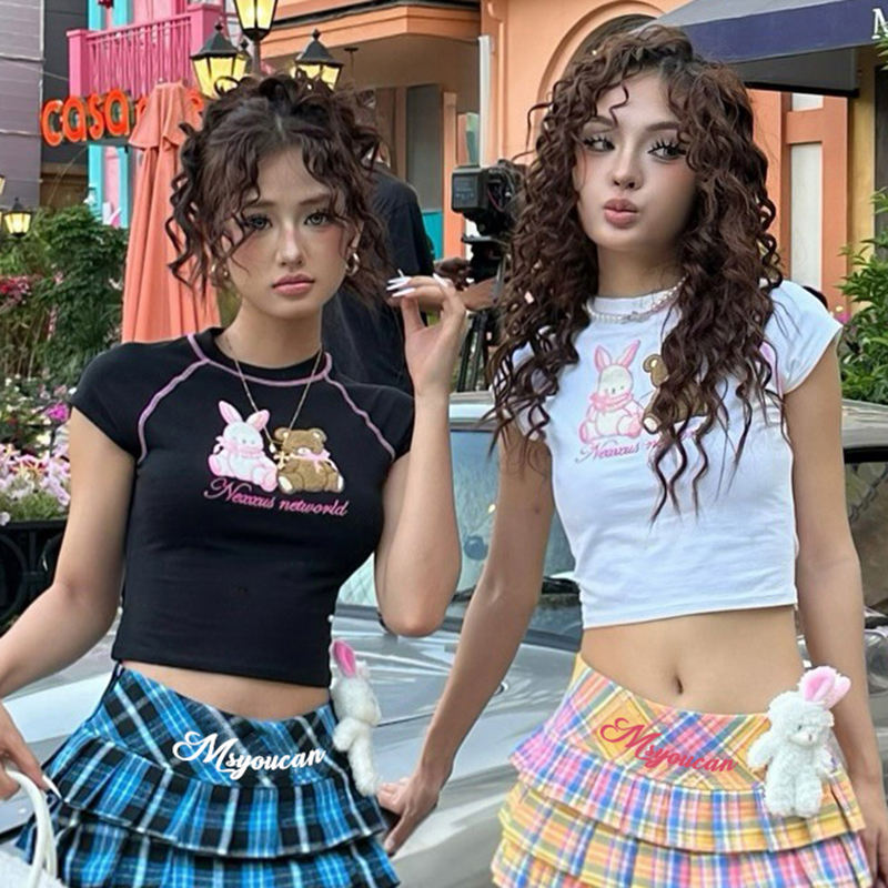 เสื้อยืดครอปคอกลมพิมพ์ลายหมีและกระต่ายน่ารักสำหรับผู้หญิง