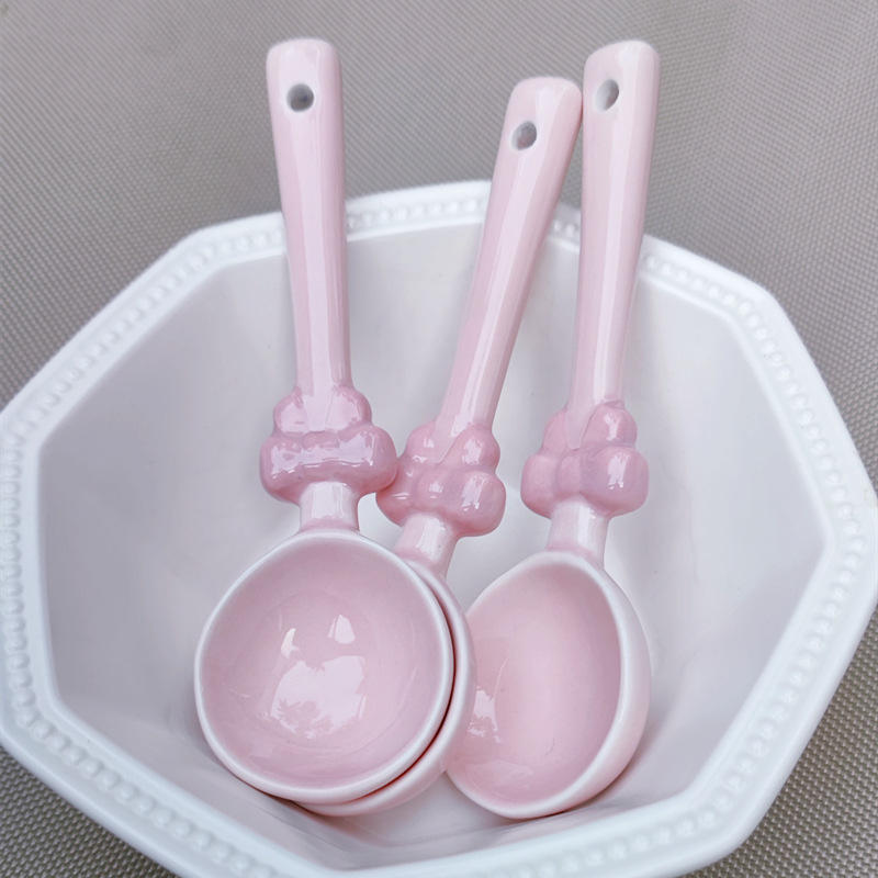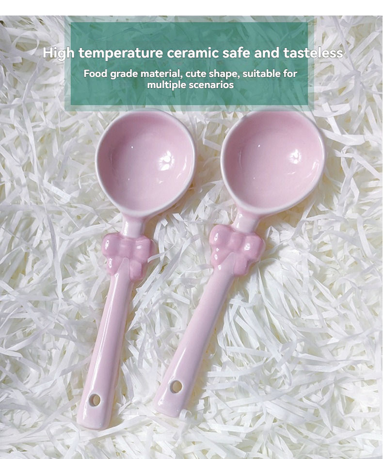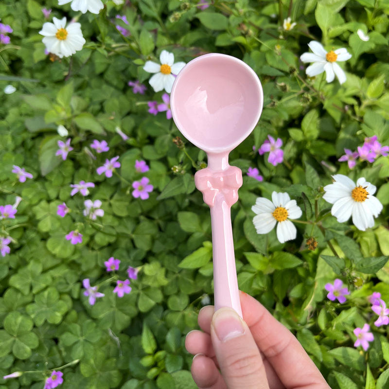 ช้อนขนมหวานลายเพ้นท์มือสไตล์สาวหวานน่ารัก ช้อนผสมสีชมพูประดับโบว์สุดสร้างสรรค์