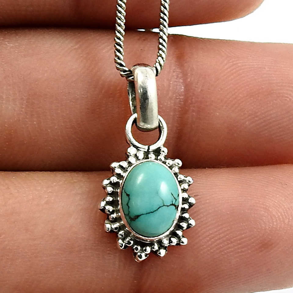จี้อัญมณีสีเทอร์ควอยซ์สไตล์โบฮีเมียนคลาสสิกจี้ดีไซน์ตัดรูปวงรีน่ารักที่ทำจากเงิน925