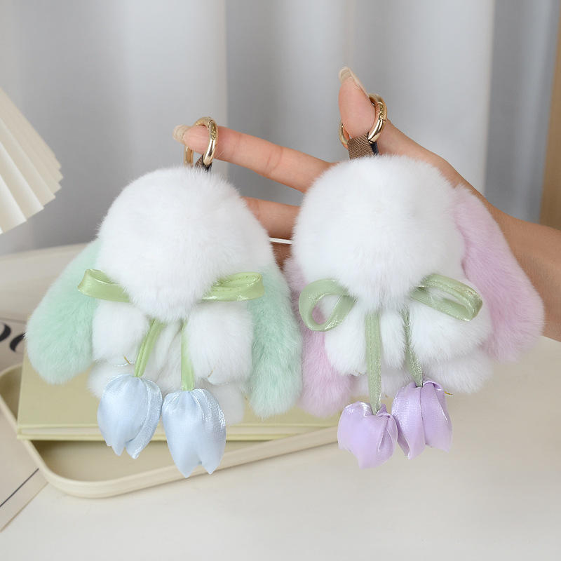 พวงกุญแจขนกระต่ายเร็กซ์แท้น่ารักจี้กระต่ายขนาดเล็กกระเป๋าของผู้หญิงพวงกุญแจรถ