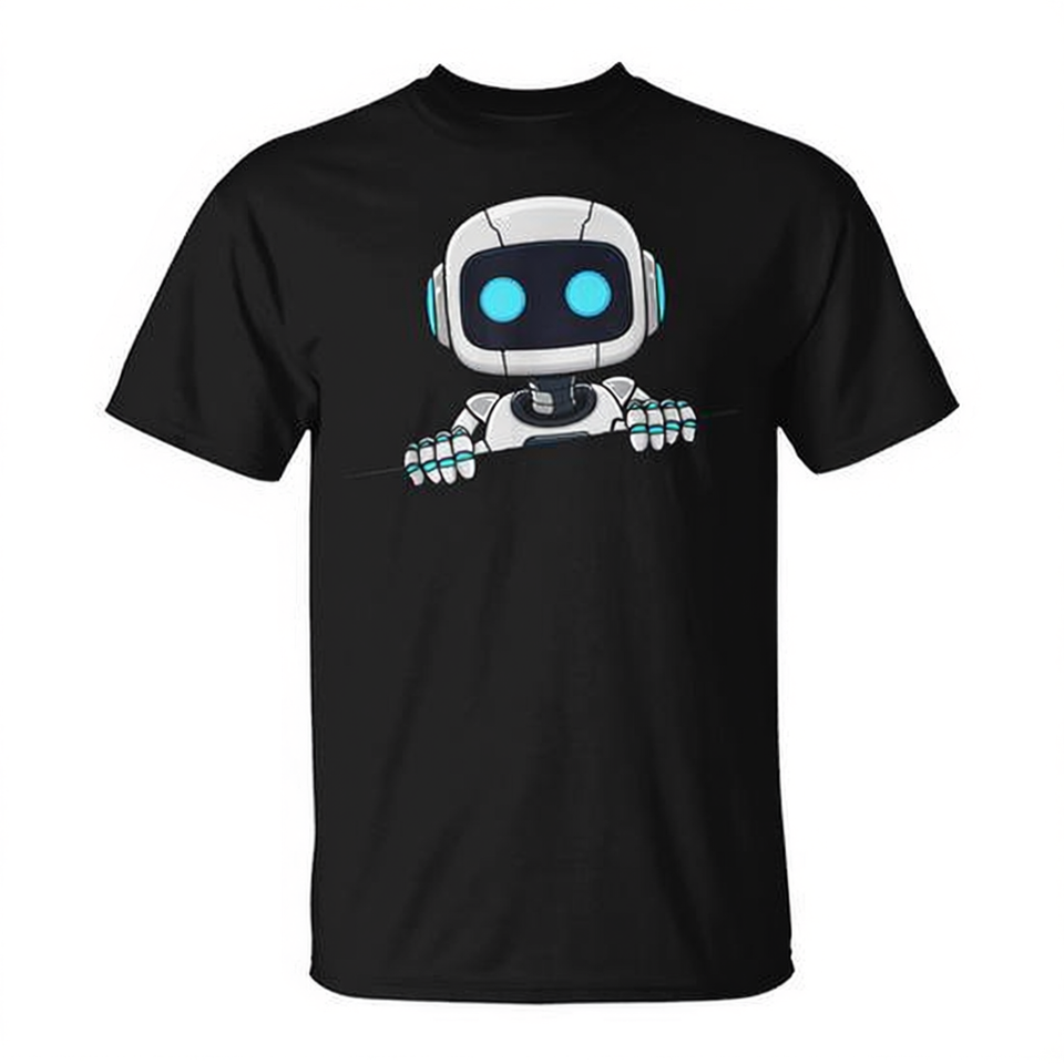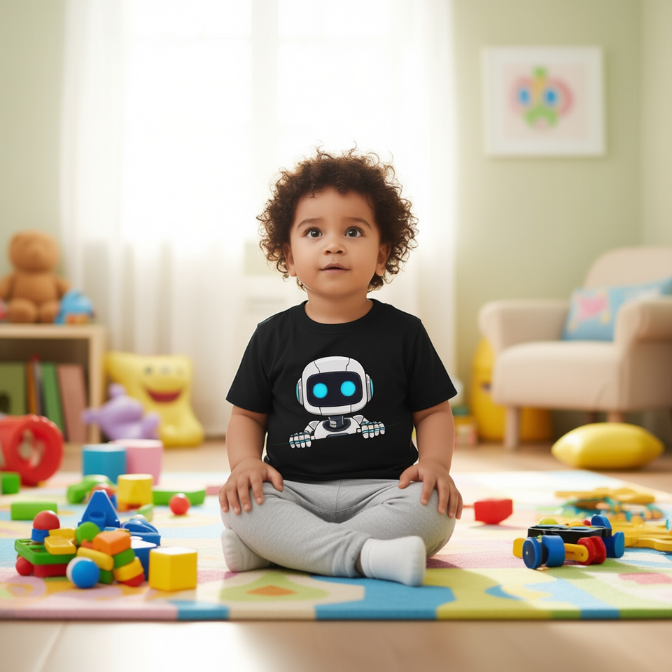 เสื้อยืดลายหุ่นยนต์น่ารักสำหรับเด็ก ดีไซน์หุ่นยนต์ AI สีดำ แขนสั้น