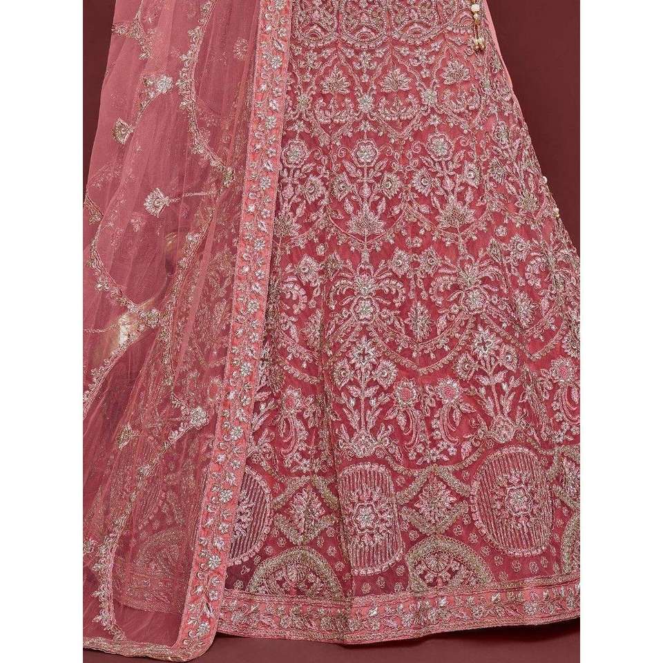 ชุดแต่งงานตาข่ายผ้านิ่มปักลายดอกกุหลาบสีชมพูแบบดั้งเดิม lehenga choli
