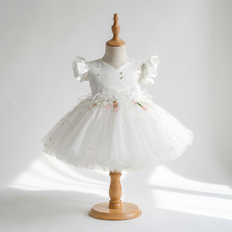 ชุดเดรสเด็กผู้หญิงสีขาวน่ารักประดับมุก แต่งกระโปรงบัลเลต์สั้น ผ้าทูลล์ลูกไม้ ชุดเดรสสั้นสำหรับงานแต่งงาน ชุดเจ้าหญิงแสนสวยสำหรับงานปาร์ตี้หรืองานประกวด