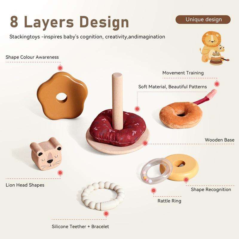 ของเล่นไม้รูปสัตว์น่ารักแบบซ้อนได้ พร้อมวงแหวนผ้าเนื้อนุ่มและเสียงเขย่า สำหรับเด็กทารก เสริมพัฒนาการตามแนวมอนเตสซอรี่