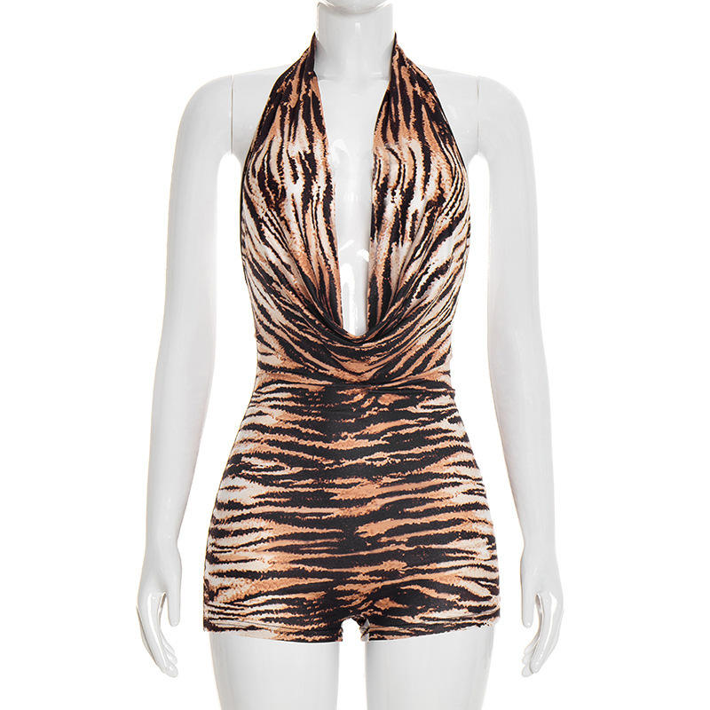 วิวิบลูค์ D26RP046 ชุดรอมเปอร์ลำลองสำหรับผู้หญิงลายเสือ คอเสื้อแบบผูกหลังเปลือยเซ็กซี่ ชุดรอมเปอร์แบบชิ้นเดียวสำหรับสุภาพสตรี