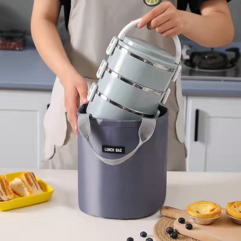 ถุงอาหารกลางวันทรงกระบอกแบบมีฉนวน กระเป๋าเก็บความร้อนทรงกลมขนาดใหญ่สำหรับการเดินทางทำงานอเนกประสงค์ สีเทา สีฟ้าอ่อน สีกรมท่า สีเบจ สีดำ สีชมพู