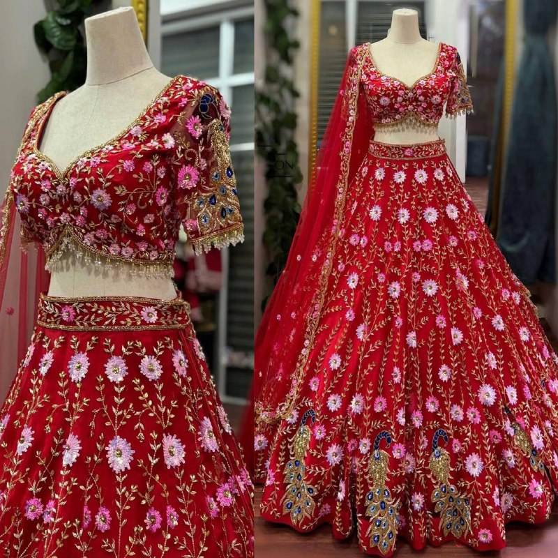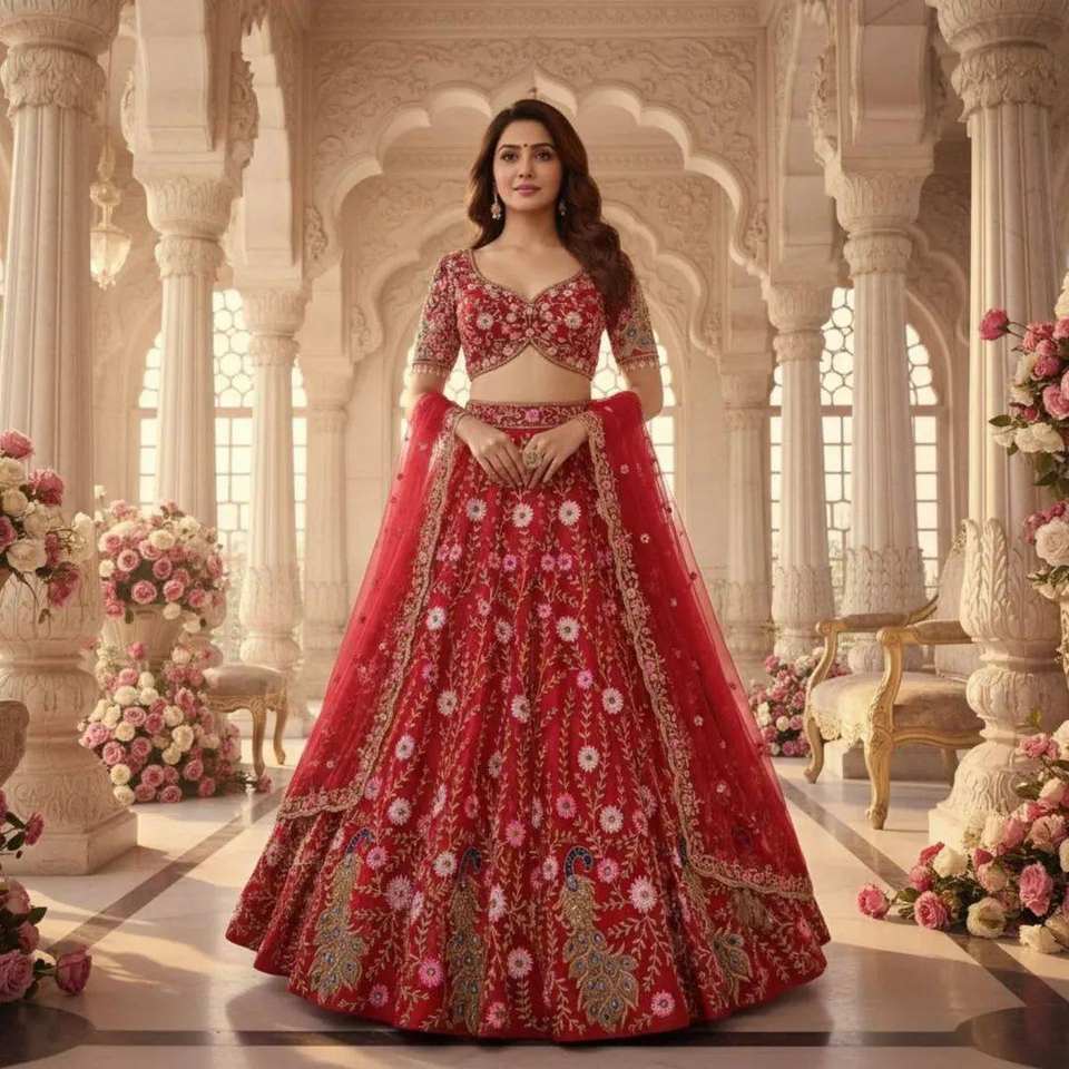 ดีแฟชั่นกูรู ชุดเลเฮนกาผ้าเน็ตเนื้อนุ่ม ดีไซน์หรูหรา ยาวกรอมพื้น ตกแต่งด้วยงานปักเลื่อมสวยงาม ประดับด้วยผ้าซ้อนหลายชั้น เหมาะสำหรับเจ้าสาว