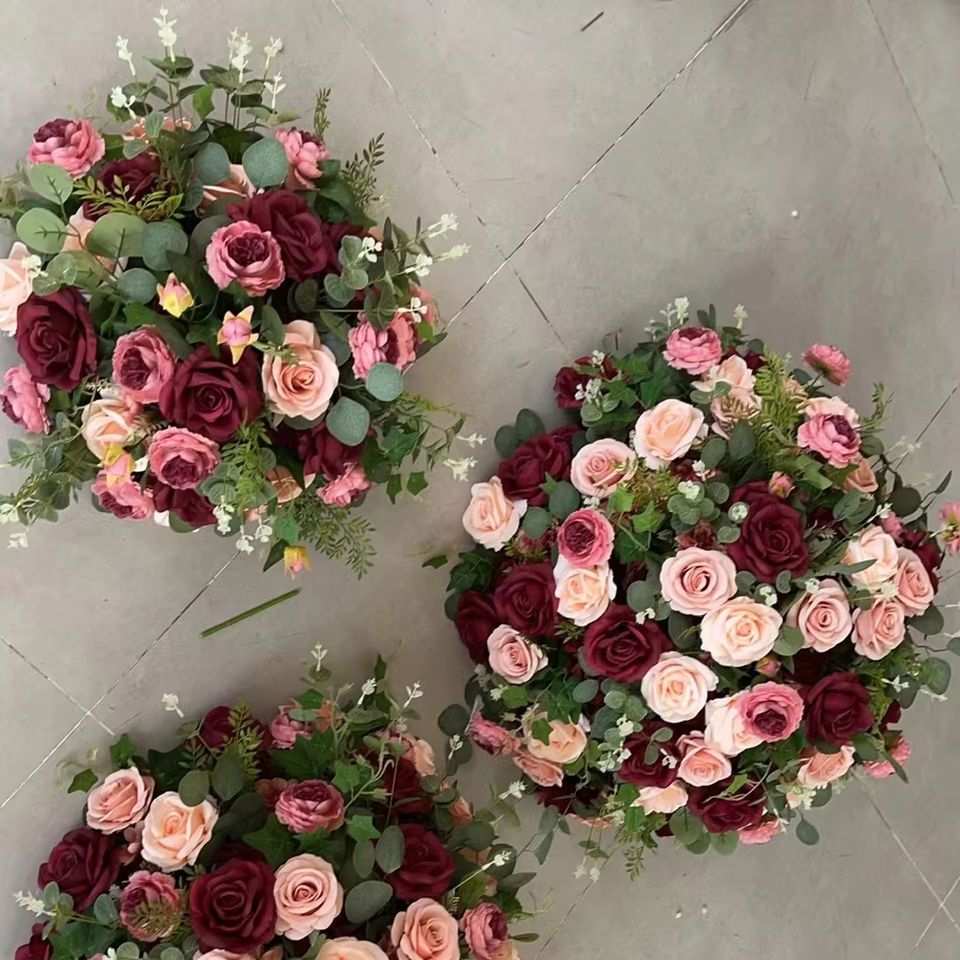 ลูกบอลดอกไม้ประดิษฐ์ทำจากผ้าไหมสำหรับตกแต่งในงานแต่งงานขนาด50ซม. 60ซม. ลูกบอลดอกไม้สีชมพูสีแดงวางตรงกลาง D-FB046
