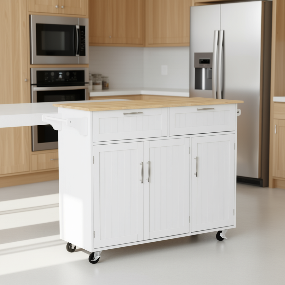 D0100XFFKAT เกาะครัวเคลื่อนที่สีขาว ท็อปไม้ยางพารา 2 ลิ้นชัก ดีไซน์ทันสมัย สำหรับจัดเก็บและจัดระเบียบในครัว