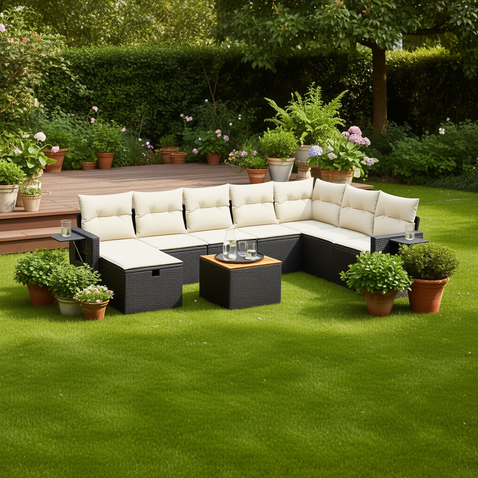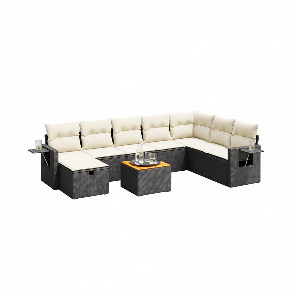 ชุดโซฟาสวนหวายเทียมสีดำแบบโมดูลาร์ D0100XFT1LP เฟอร์นิเจอร์กลางแจ้งที่ทนทาน พร้อมเบาะโฟมความหนาแน่นสูง