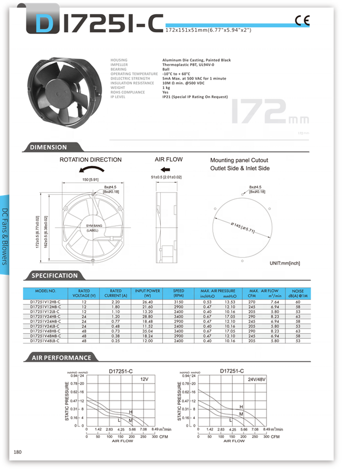 พัดลมระบายความร้อนแบบแกน D17251-C 12/24/48V DC ทนอุณหภูมิสูง ตลับลูกปืนพลาสติก OEM ขนาด 172x151x51 มม.