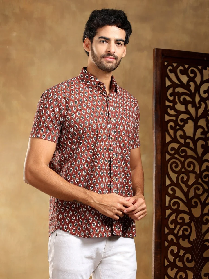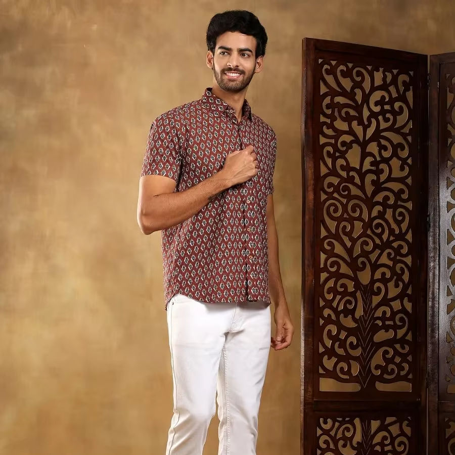 เสื้อเชิ้ตผ้าฝ้ายพิมพ์ลายด้วยมือสีมารูนสำหรับผู้ชาย DAHLEEZ | เสื้อเชิ้ตลำลองพิมพ์ลายดอกไม้พร้อมกระเป๋าปะสำหรับสวมใส่ในชีวิตประจำวันและใช้ในสำนักงาน