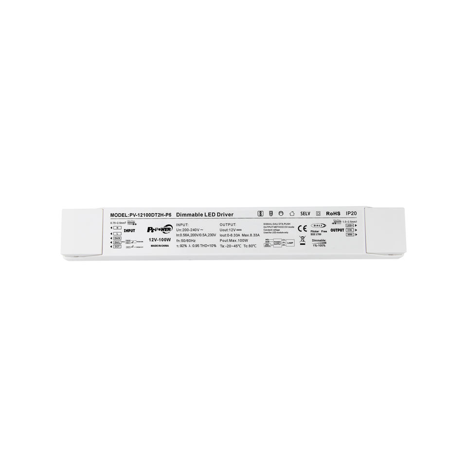 แหล่งจ่ายไฟสำหรับไฟ LED แบบหรี่แสงได้ 100W DALI-2 DT8 ป้องกันการกระพริบ 2 ช่องสัญญาณ 220-240V AC-DC 12V 24V IP20 CV PF>0.95 LED Driver