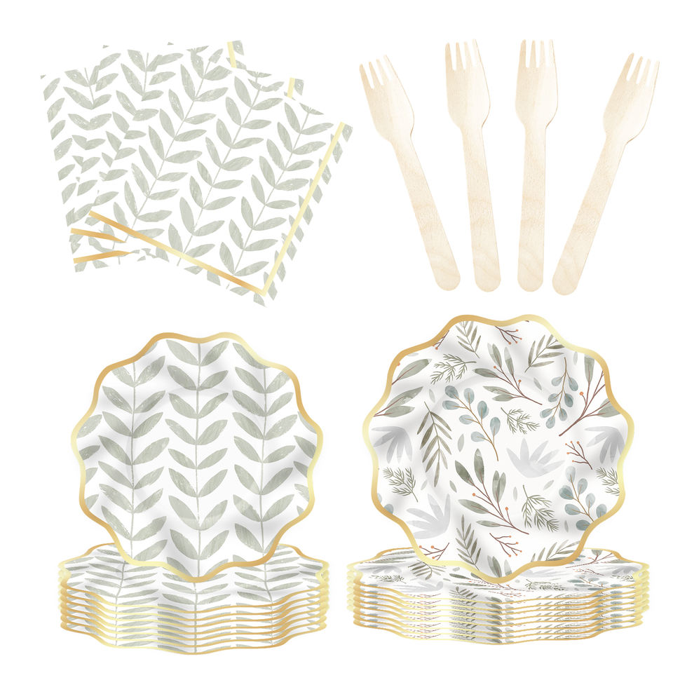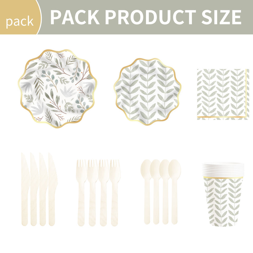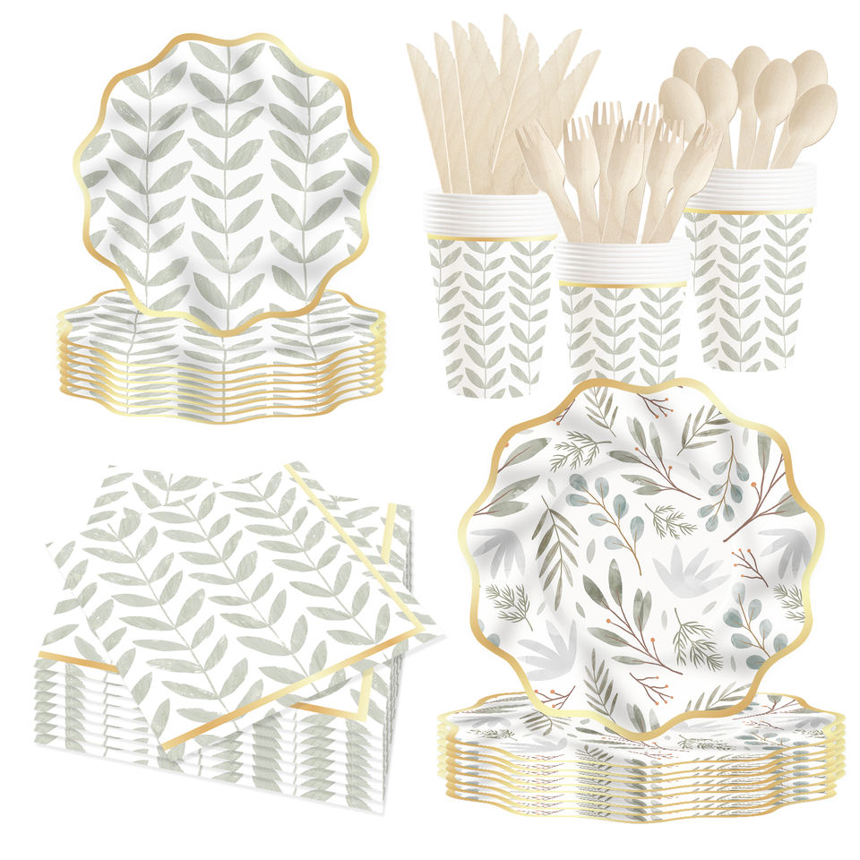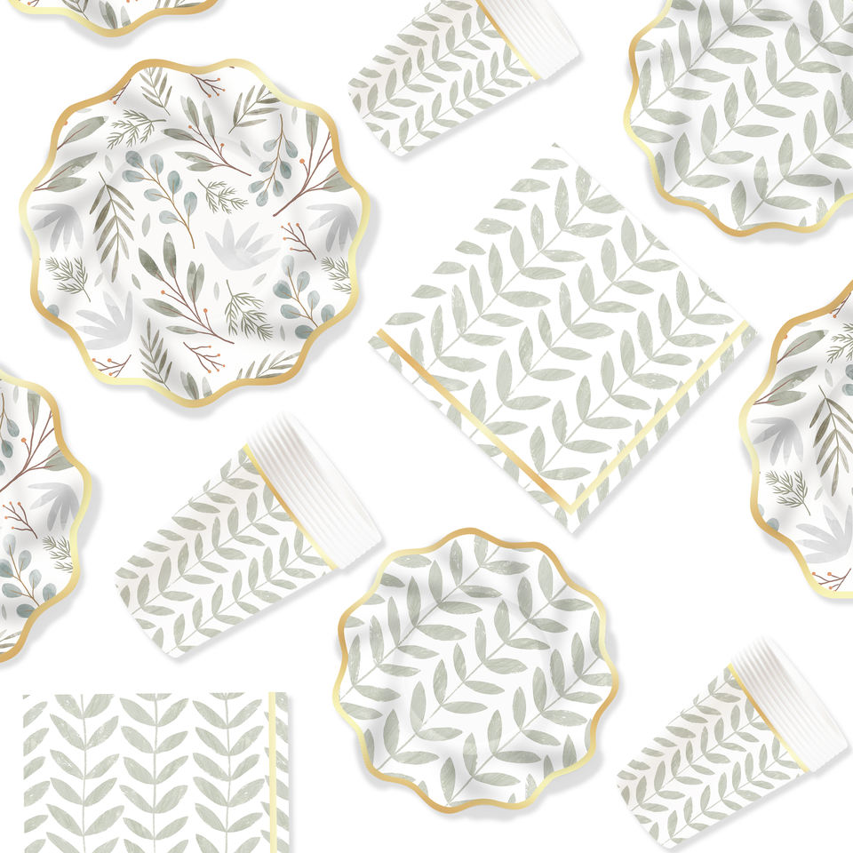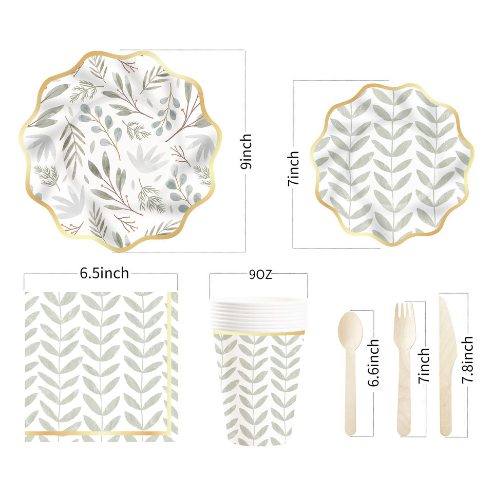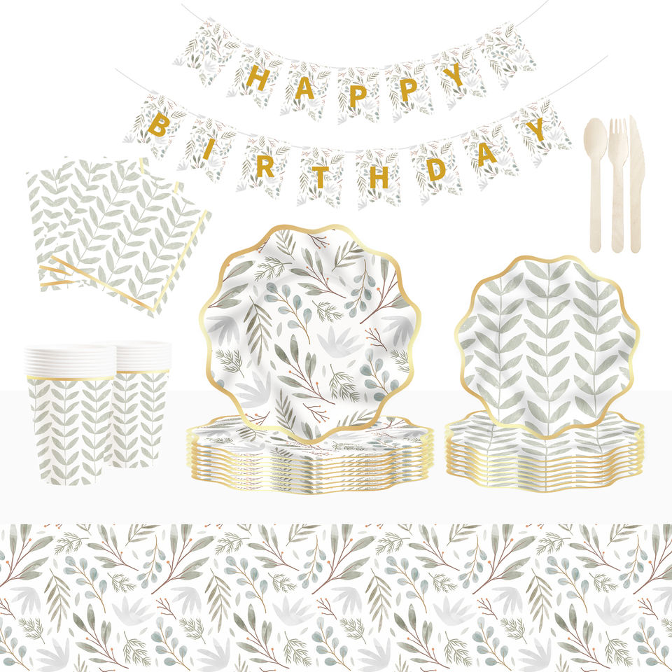 ชุดตกแต่งธีมงานวันเกิด DAMAI ขายส่งจำนวนมาก ชุดจานกระดาษลายใบไม้สีเขียวอ่อนทันสมัย ผ้าปูโต๊ะ ชุดภาชนะใช้แล้วทิ้งสำหรับงานปาร์ตี้