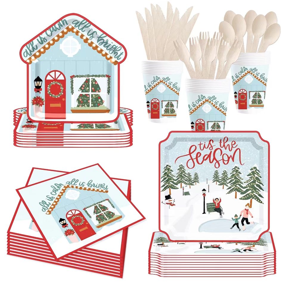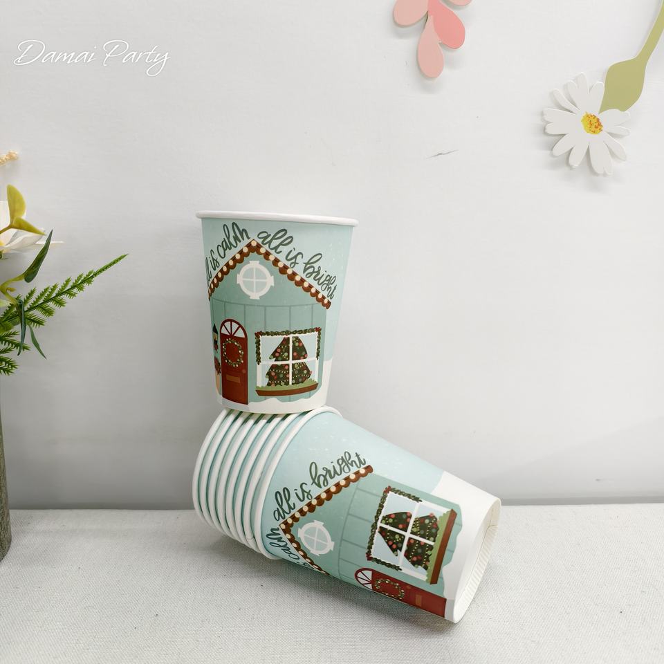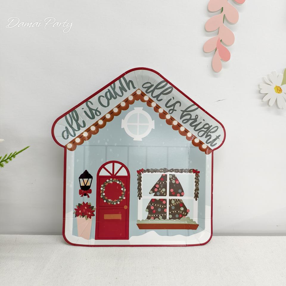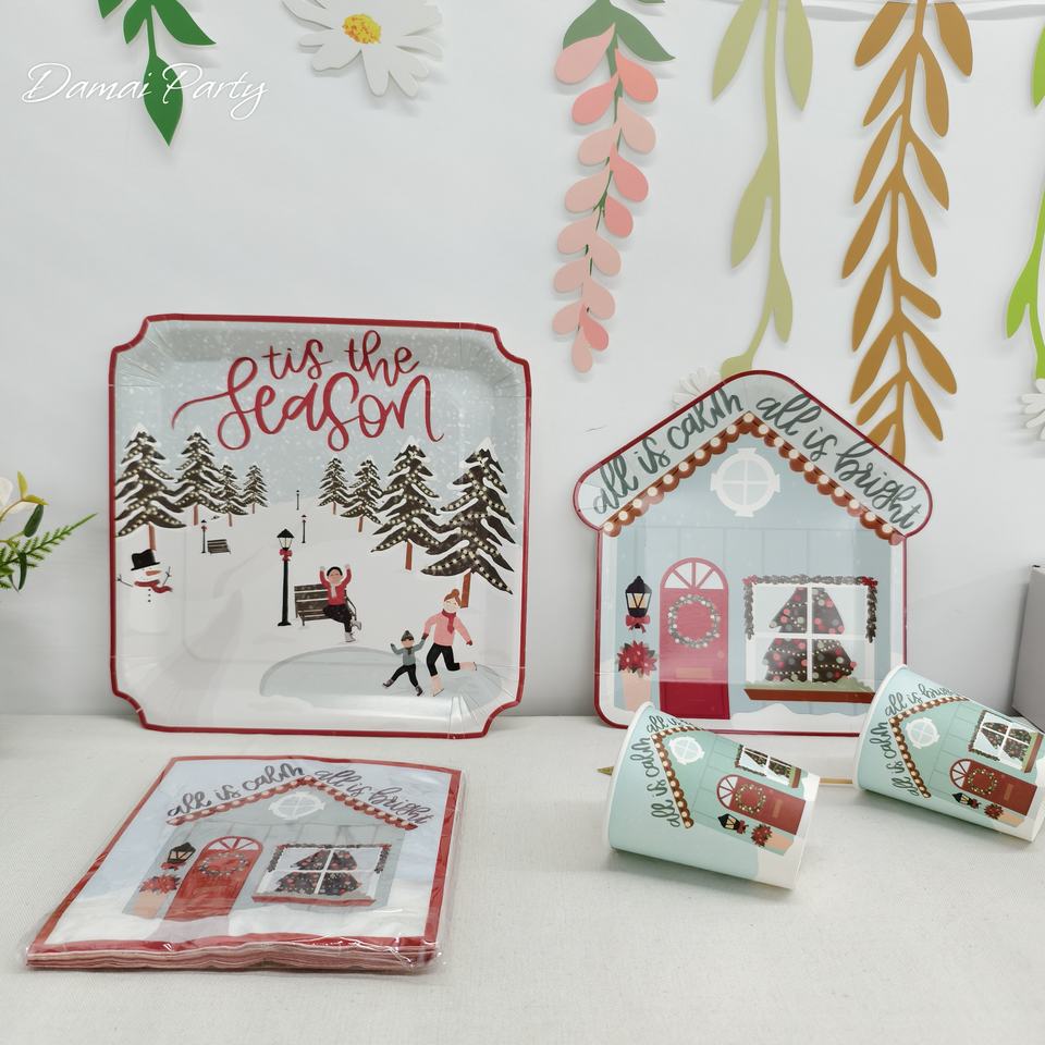 ชุดของตกแต่งคริสต์มาส DAMAI บ้านขนมปังขิงพร้อมต้นคริสต์มาส ชุดจาน ชาม แก้วกระดาษ และผ้าเช็ดปากแบบใช้แล้วทิ้งสำหรับคริสต์มาส