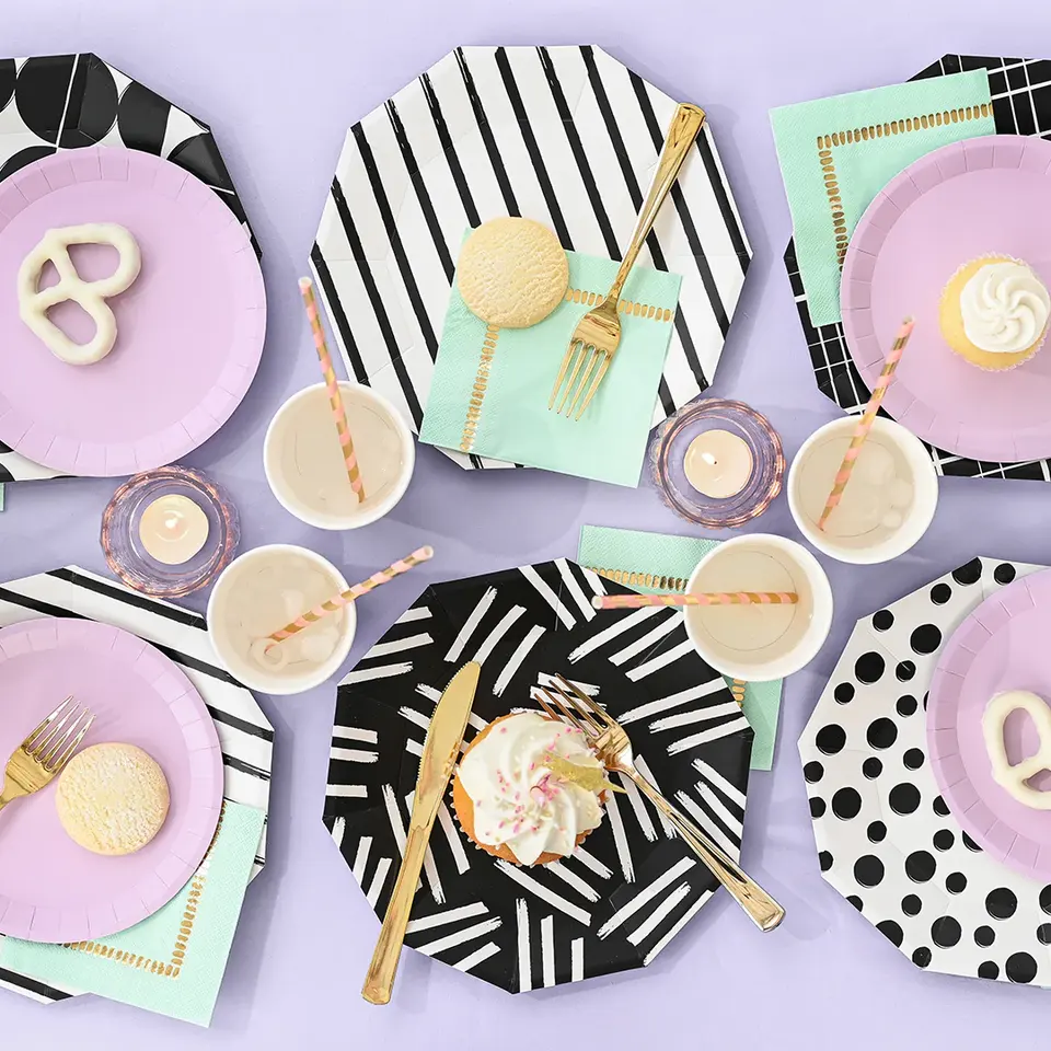 ชุดจานกระดาษรูปทรงสิบเหลี่ยมลายเรขาคณิต DAMAI สำหรับงานเลี้ยงวันเกิดเด็ก แบบใช้แล้วทิ้ง