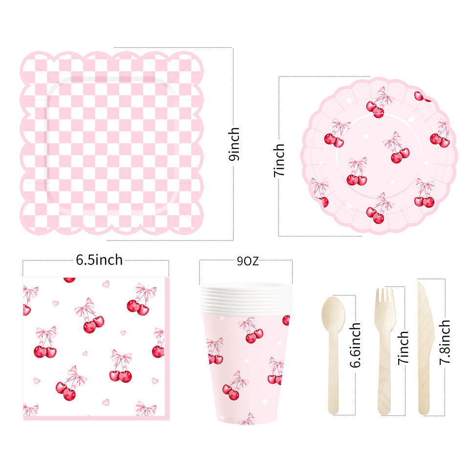 ชุดอุปกรณ์จัดงานวันเกิดเด็ก DAMAI จานลายสก็อตสีชมพูขาวพร้อมเชอร์รี่สีแดง ชุดภาชนะใช้แล้วทิ้ง กระดาษเช็ดปาก แก้ว จาน