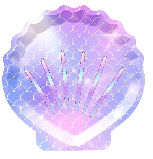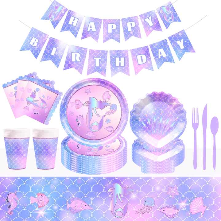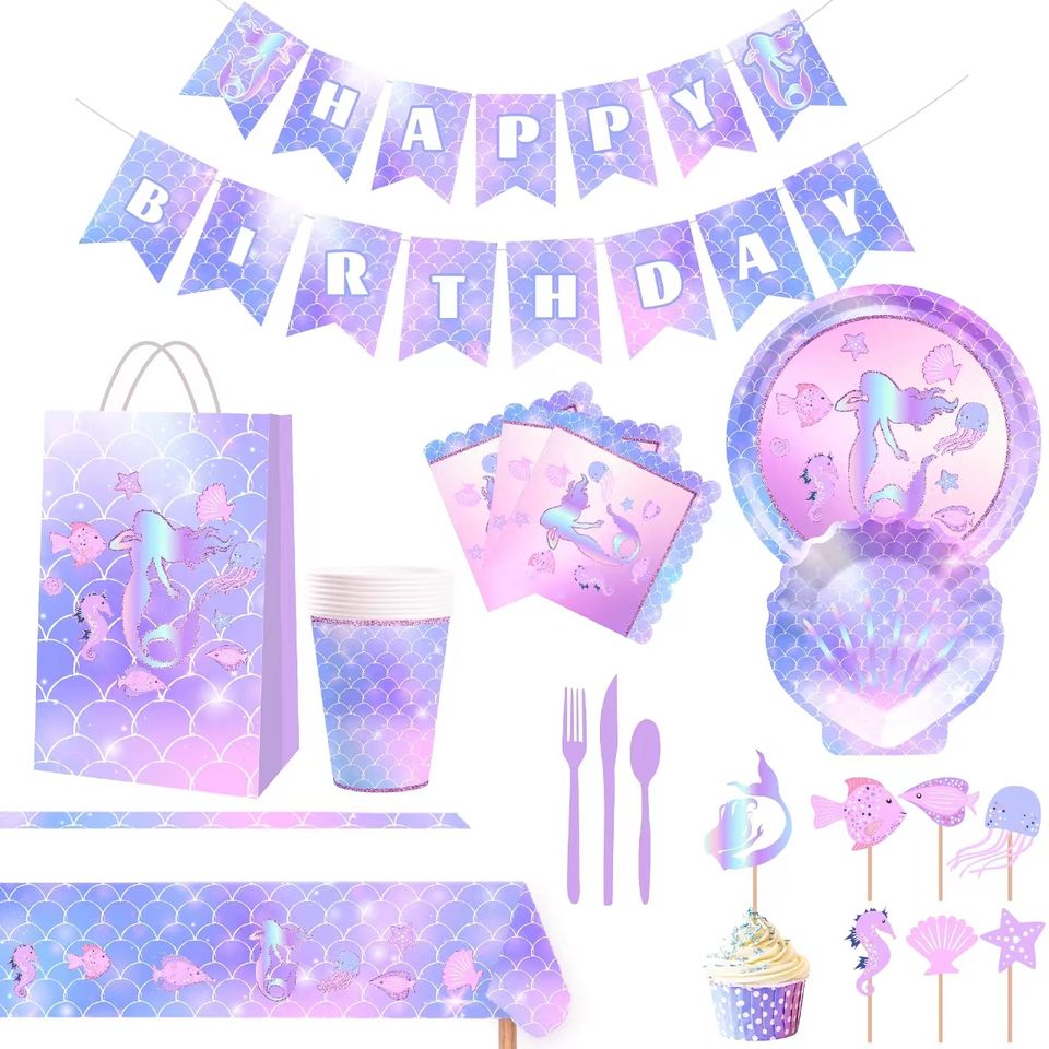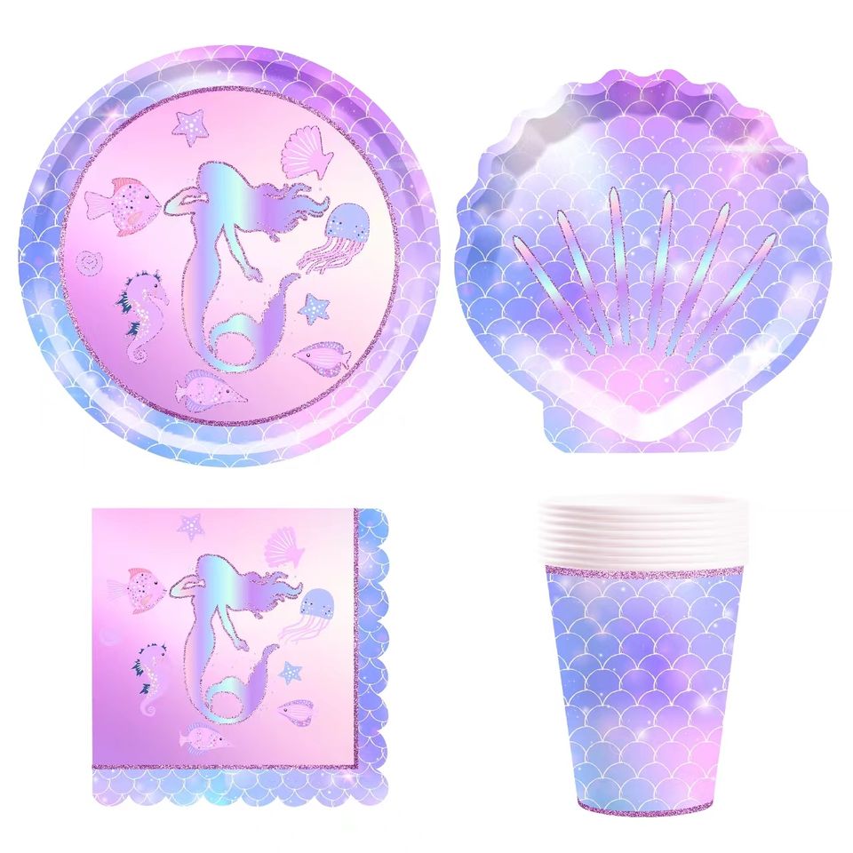 ชุดจานกระดาษลายเงือกน้อย DAMAI พร้อมจานอาหารค่ำ จานขนม ถ้วย แก้วน้ำ และผ้าเช็ดปาก สำหรับงานวันเกิดเด็กผู้หญิงธีมมหาสมุทร