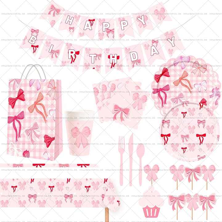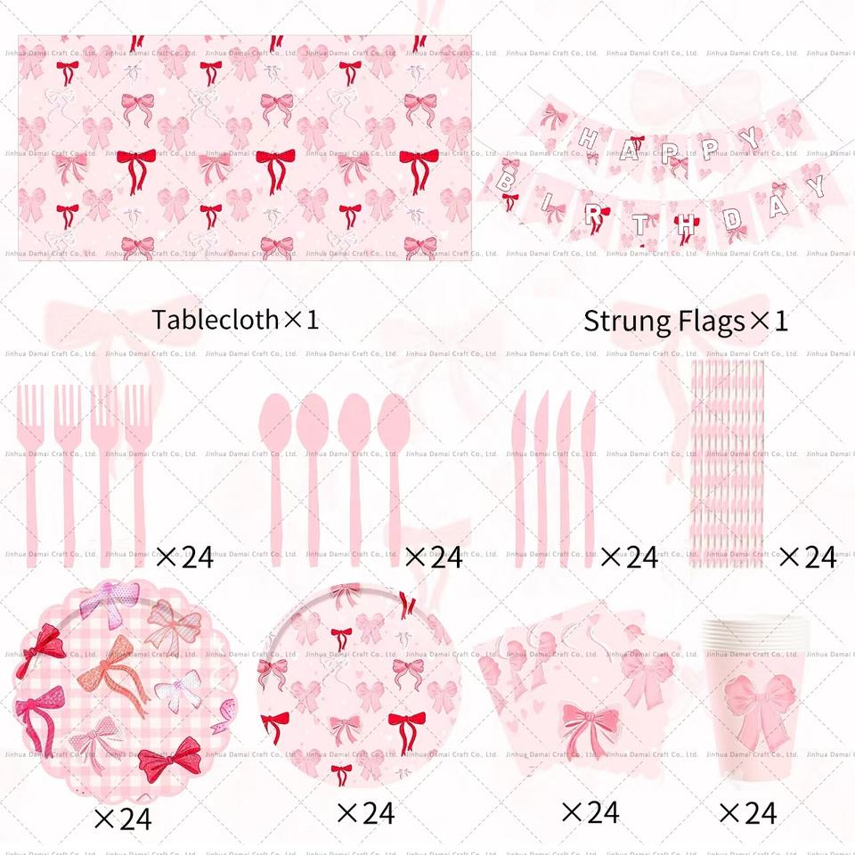 DAMAI New Design Custom Bowknot Paper Plate Tableware Kit Pink Disposable Plate for Girl Birthday Party Table Cloths for Events