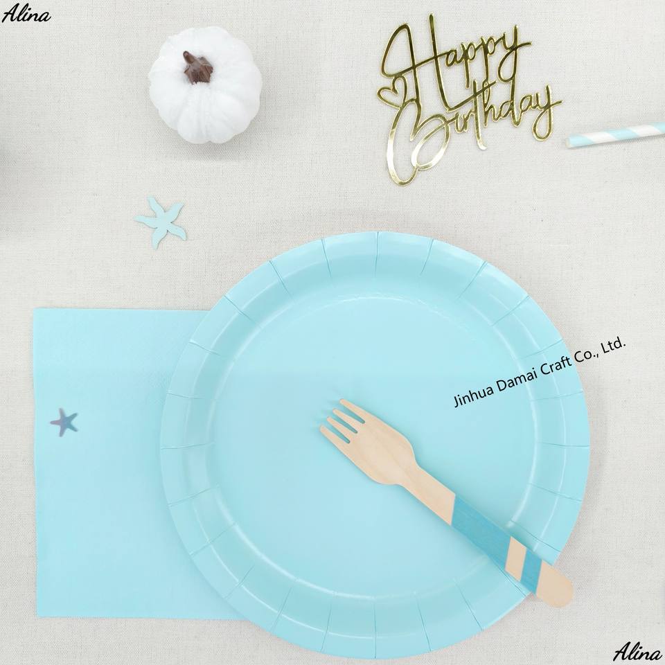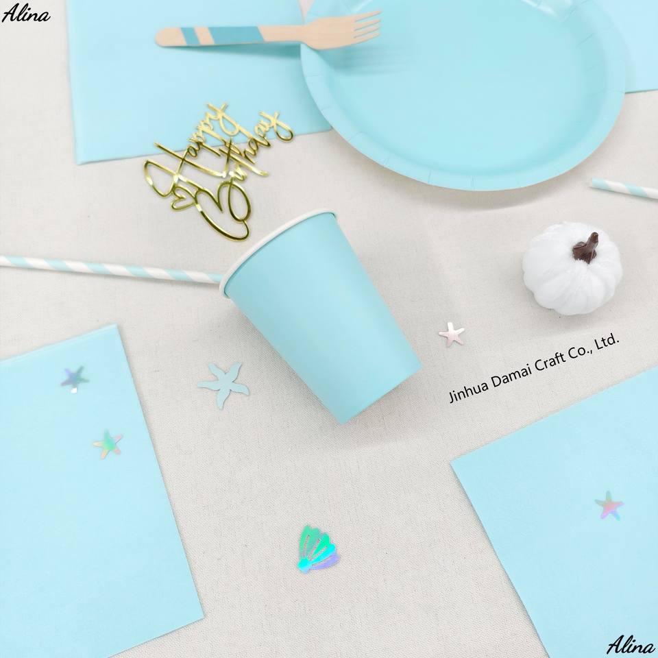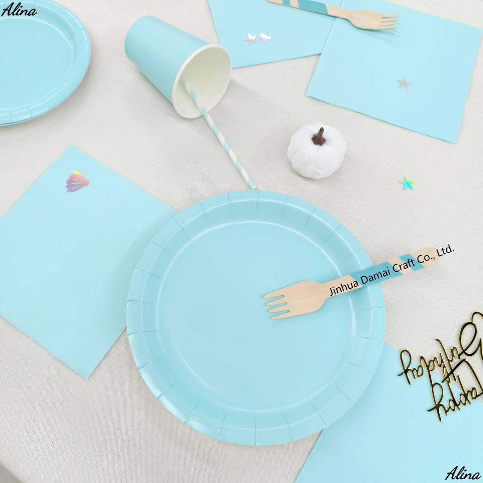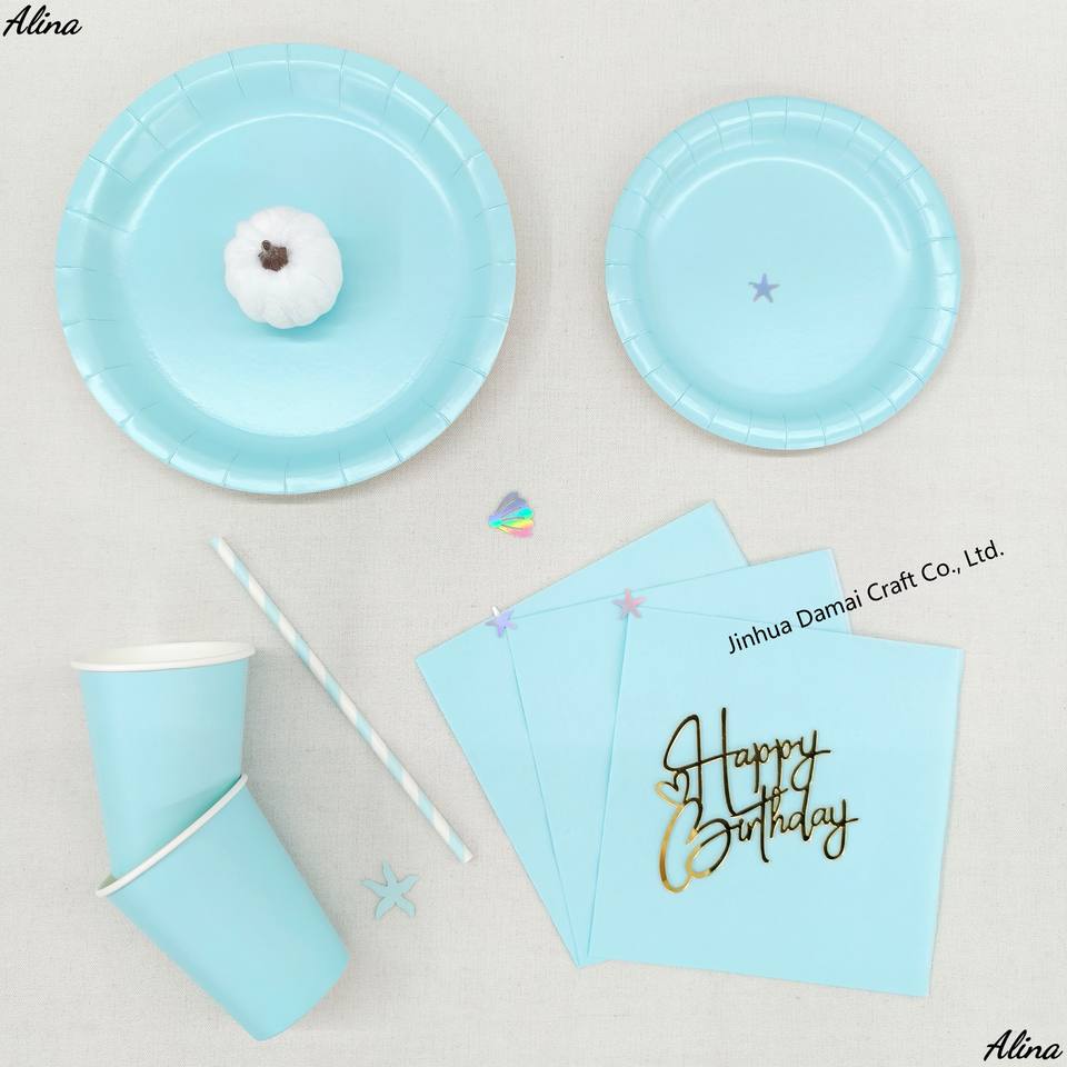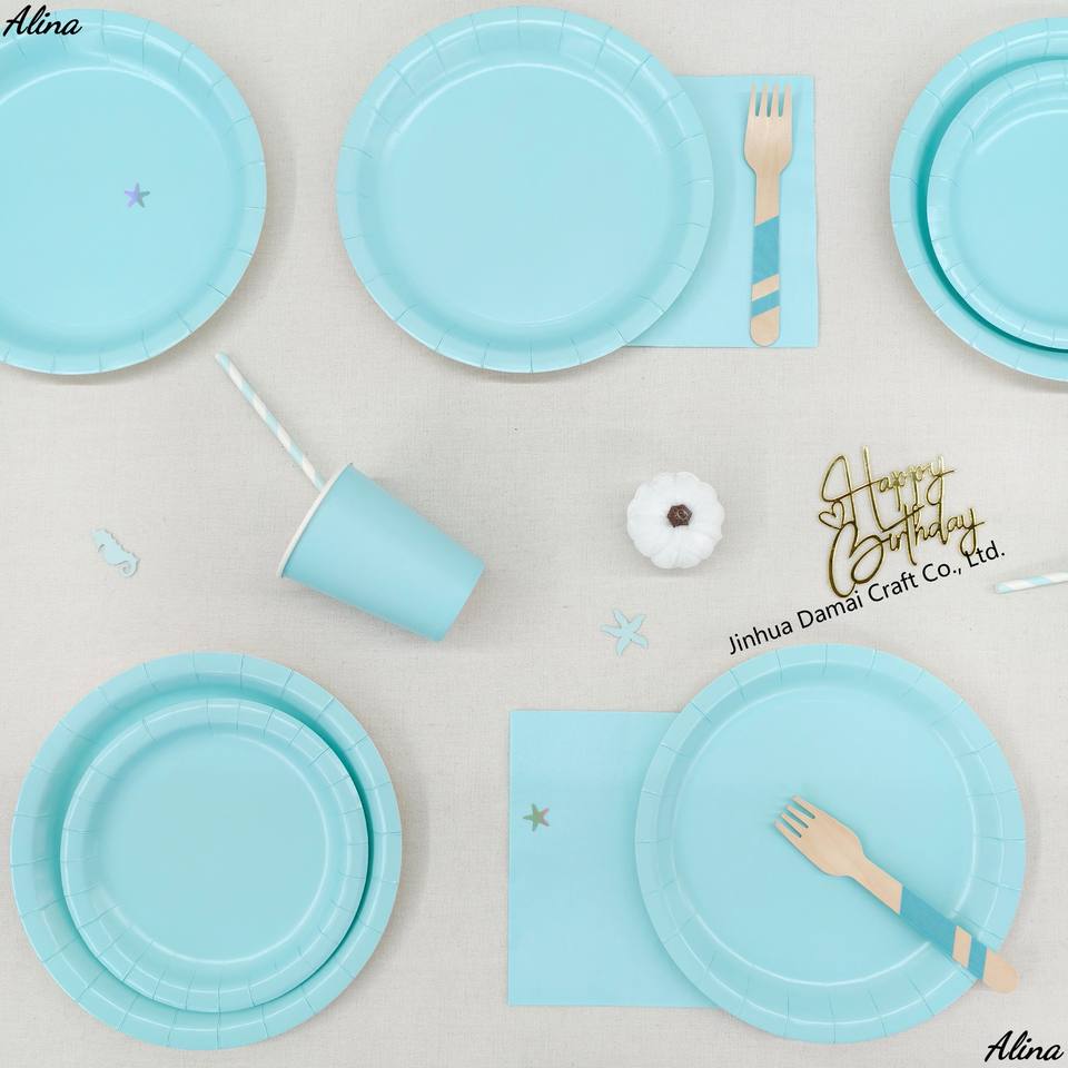 ชุดภาชนะใช้แล้วทิ้งสีพื้น DAMAI สีฟ้าอ่อน อุปกรณ์จัดงานปาร์ตี้ วันเกิด กิจกรรมแคมป์ปิ้ง ของตกแต่งโต๊ะ กระดาษเช็ดปาก แก้ว จาน