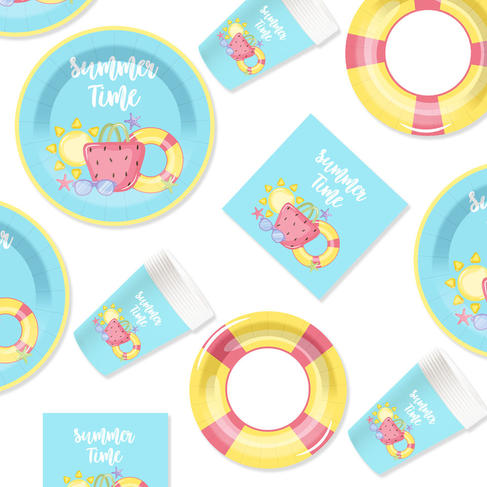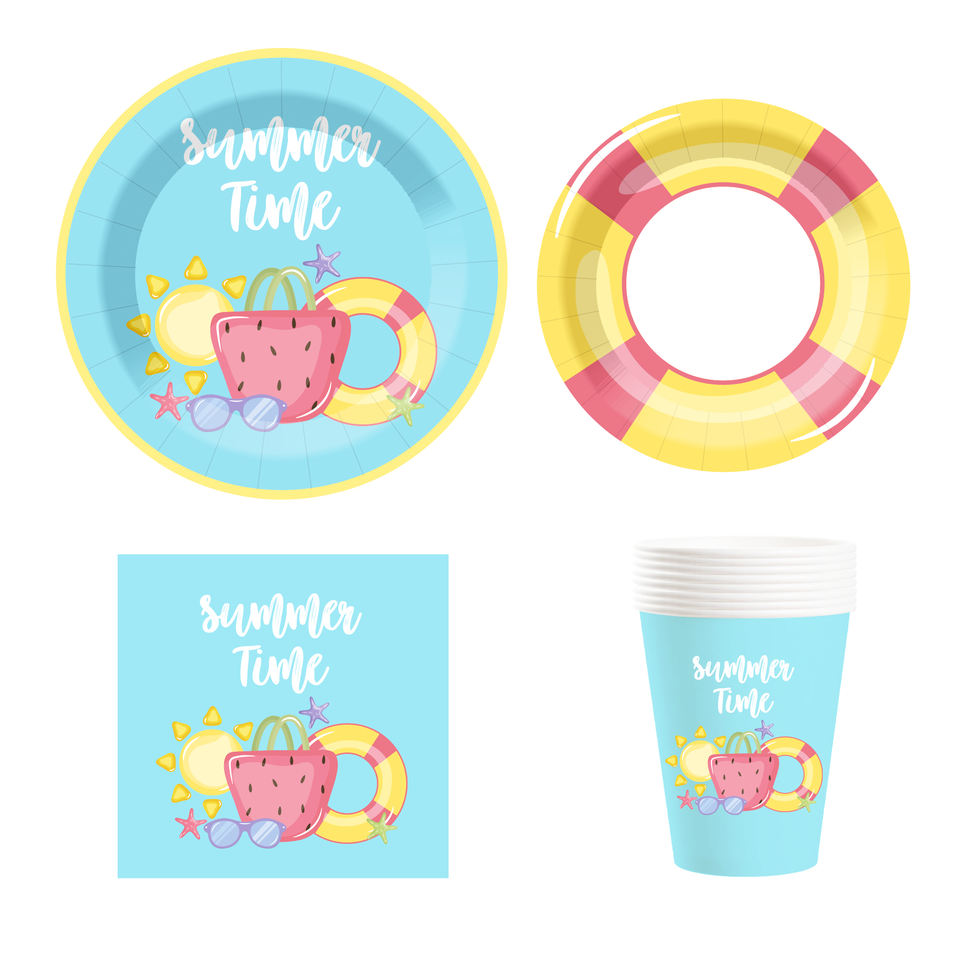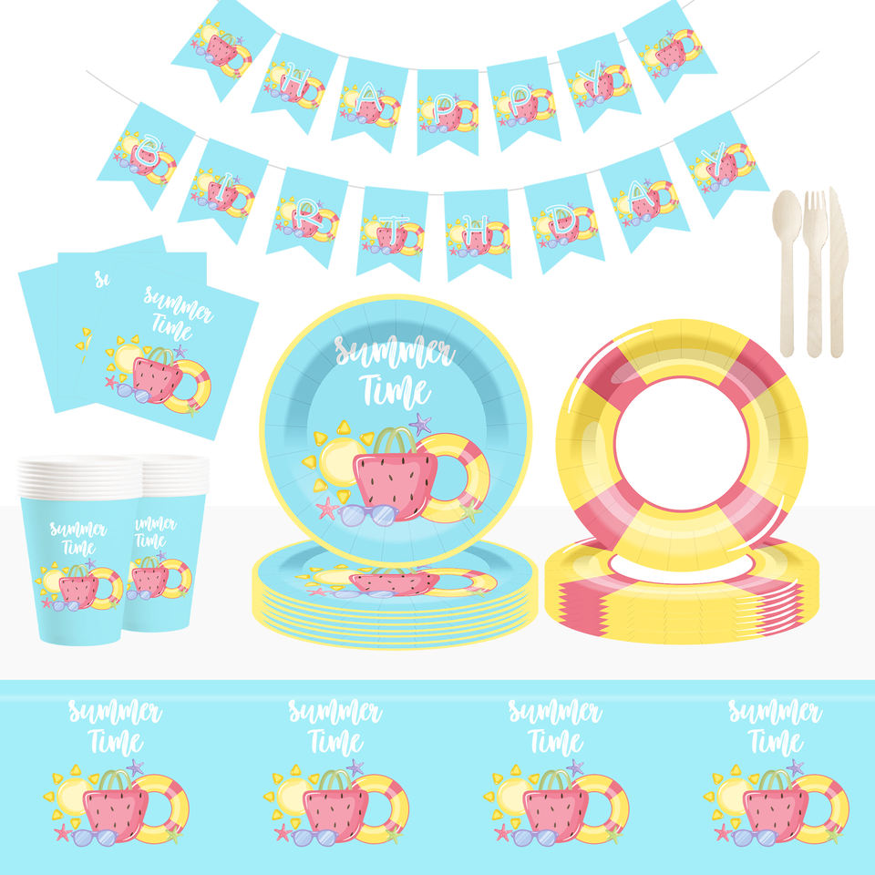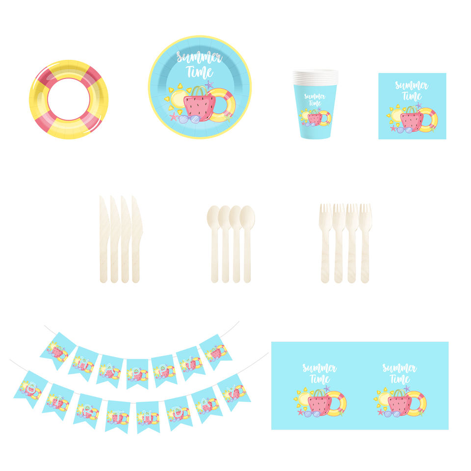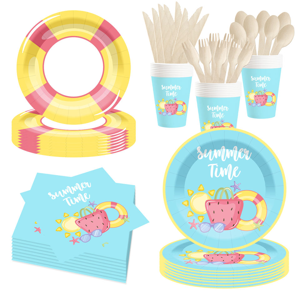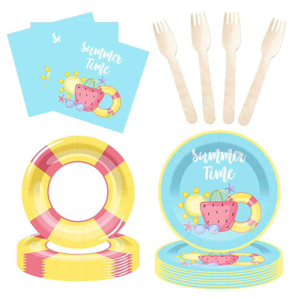 ชุดอุปกรณ์จัดเลี้ยงปาร์ตี้ริมสระน้ำลายการ์ตูน DAMAI ของตกแต่งชายหาดฤดูร้อน จานและผ้าเช็ดปากสำหรับแขก 8 ท่าน ของชำร่วยงานปาร์ตี้