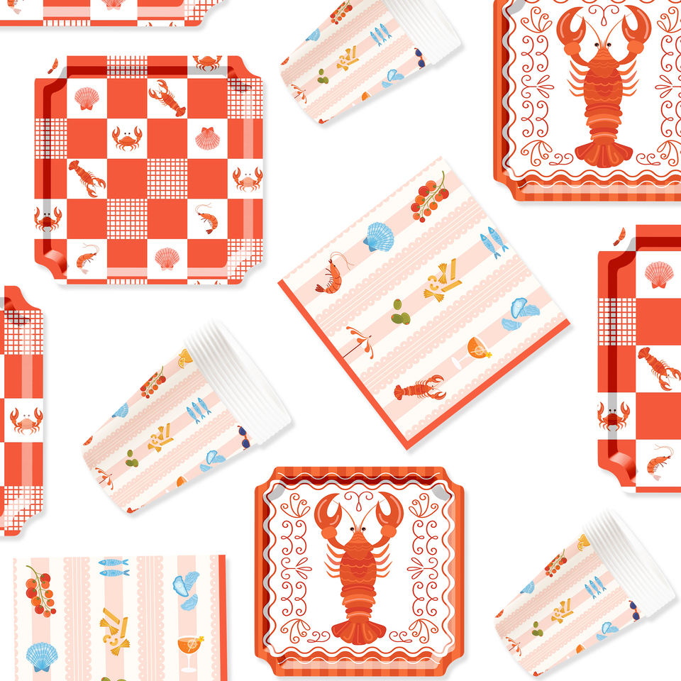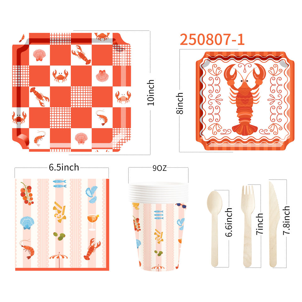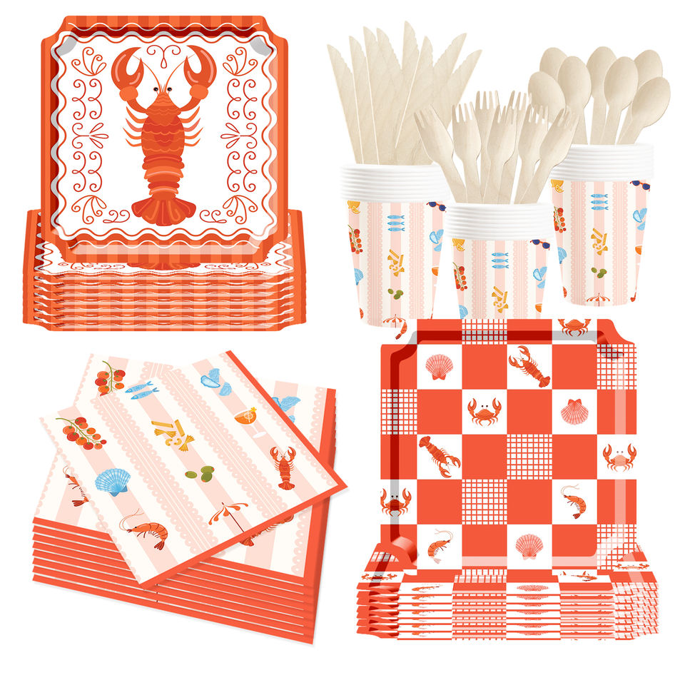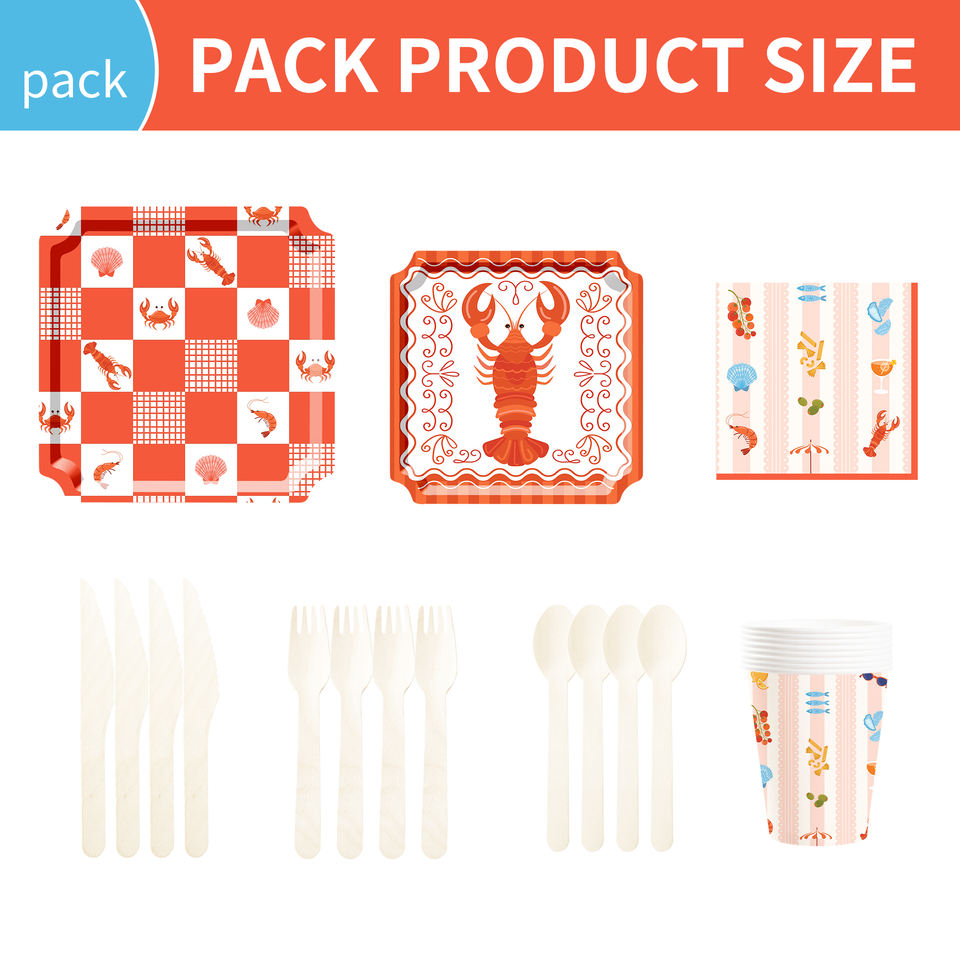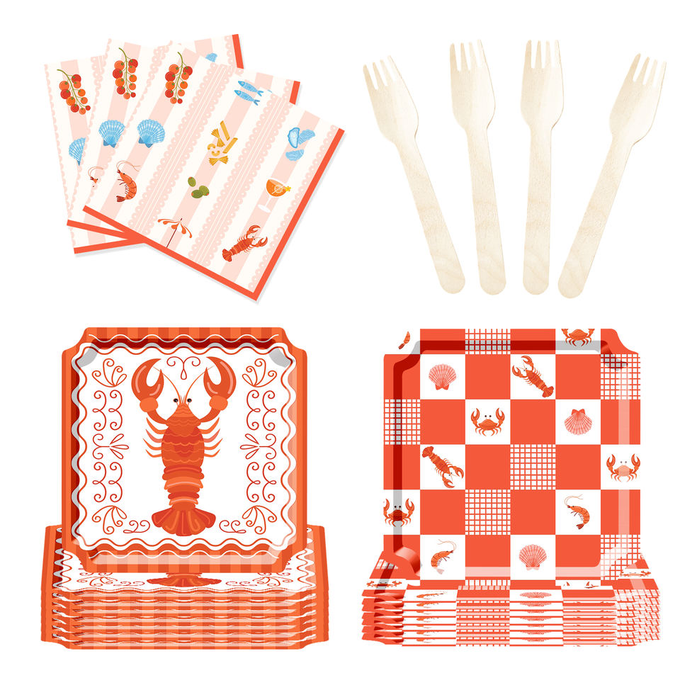 จานกระดาษลายกุ้งมังกรแดง DAMAI รูปทรงสี่เหลี่ยม แบ่งช่องเล็กๆ สำหรับอาหารทะเล พร้อมถ้วยและผ้าเช็ดปาก