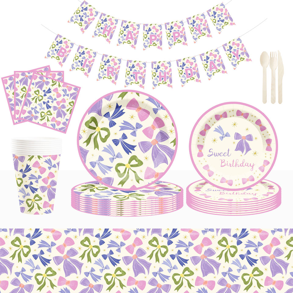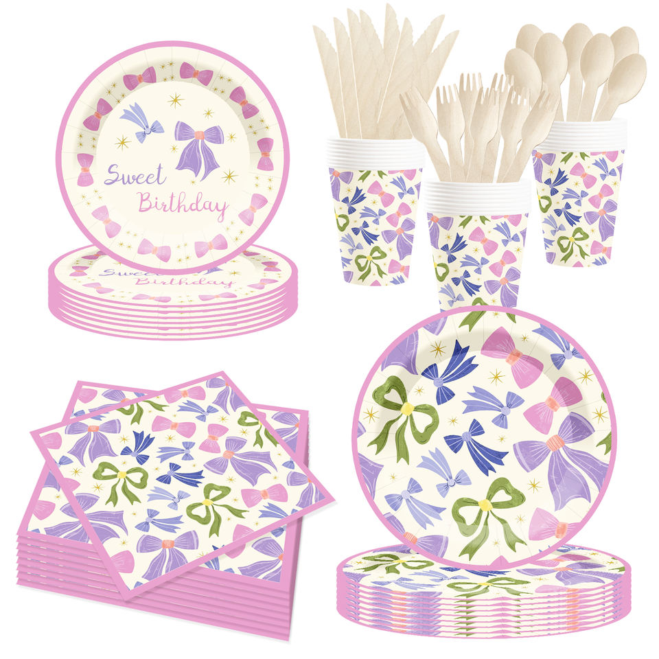 ชุดอุปกรณ์จัดงานเลี้ยงวันเกิด DAMAI ลายโบว์น่ารัก จานกระดาษ แก้วกระดาษ ผ้าเช็ดปาก ที่เสียบเค้ก ผ้าปูโต๊ะ ป้ายตกแต่ง