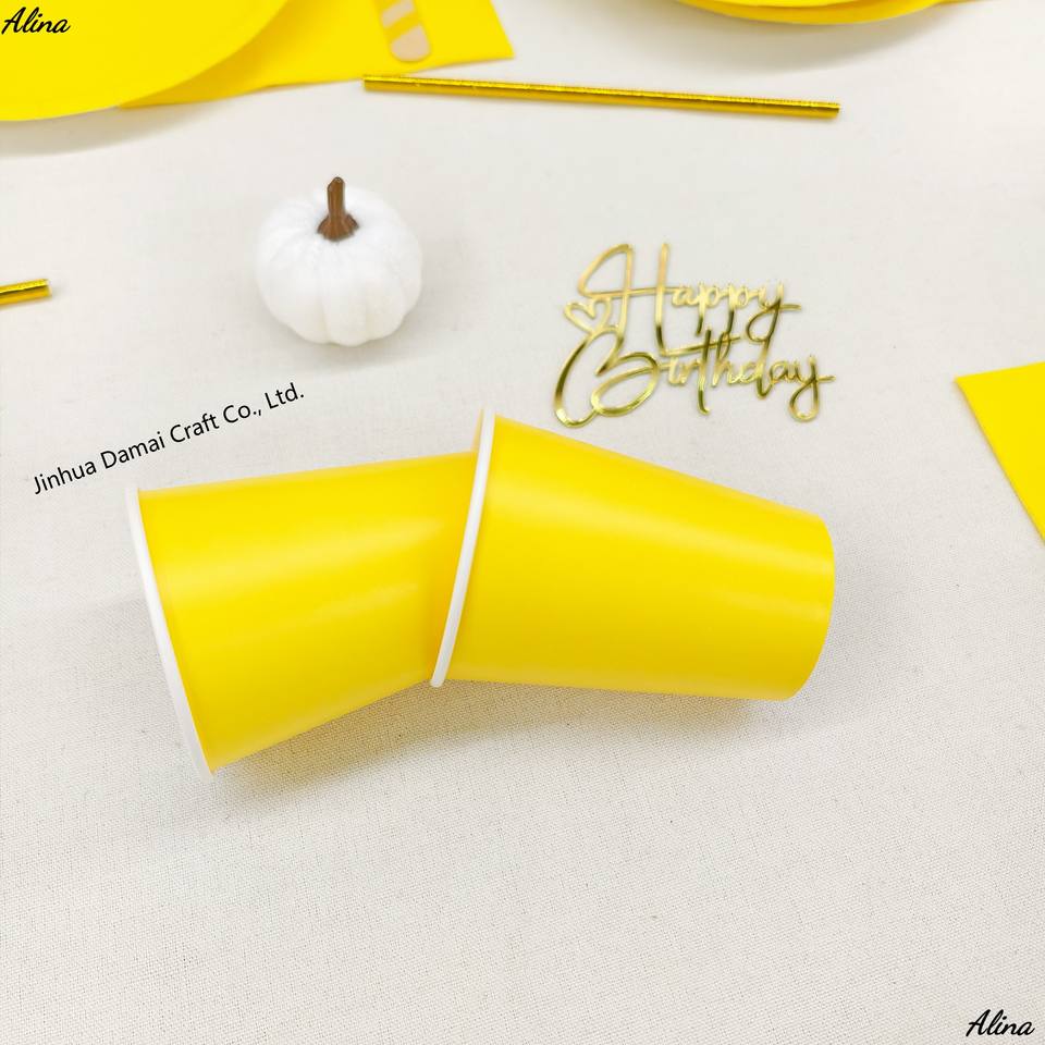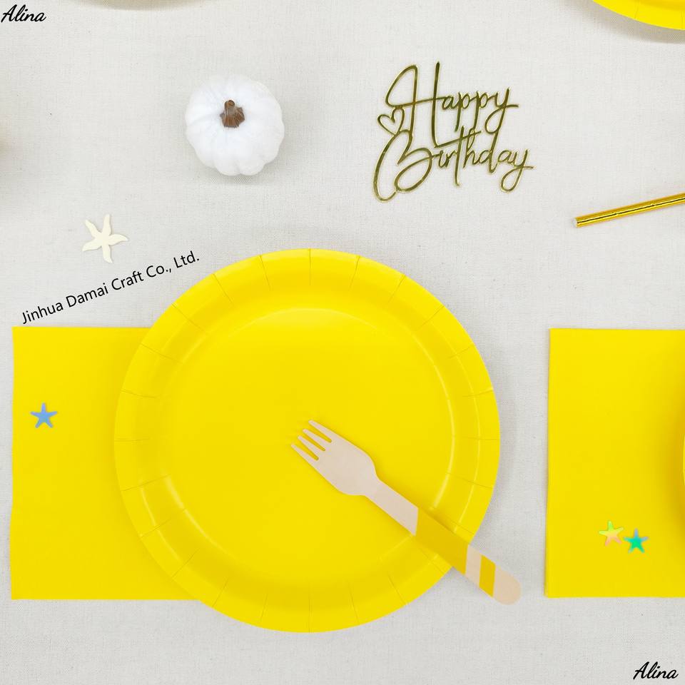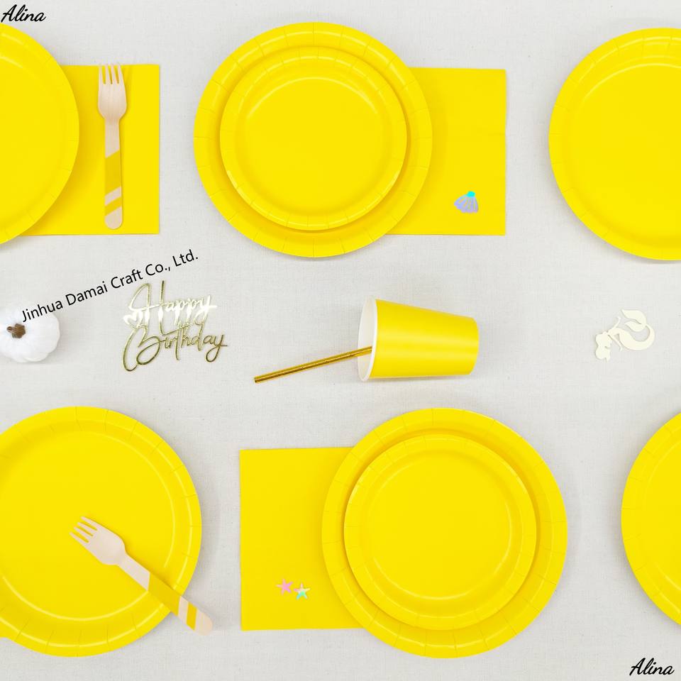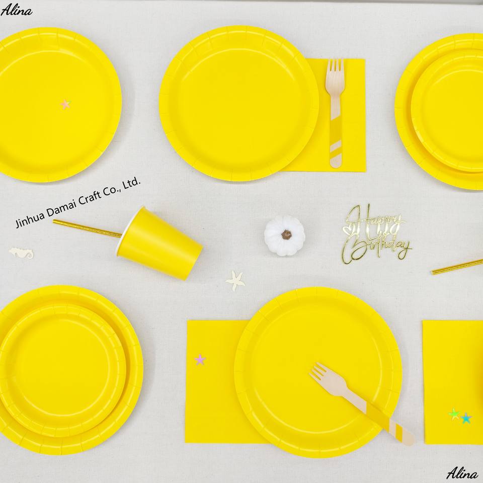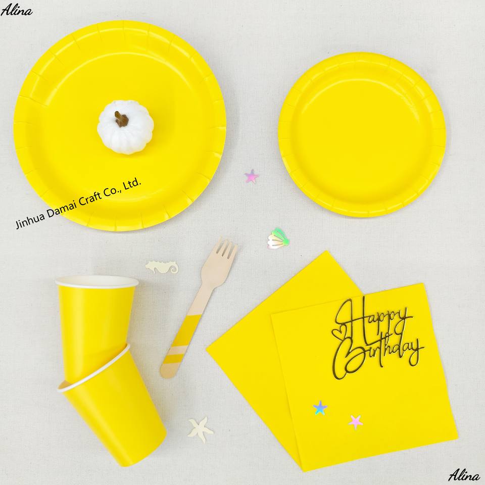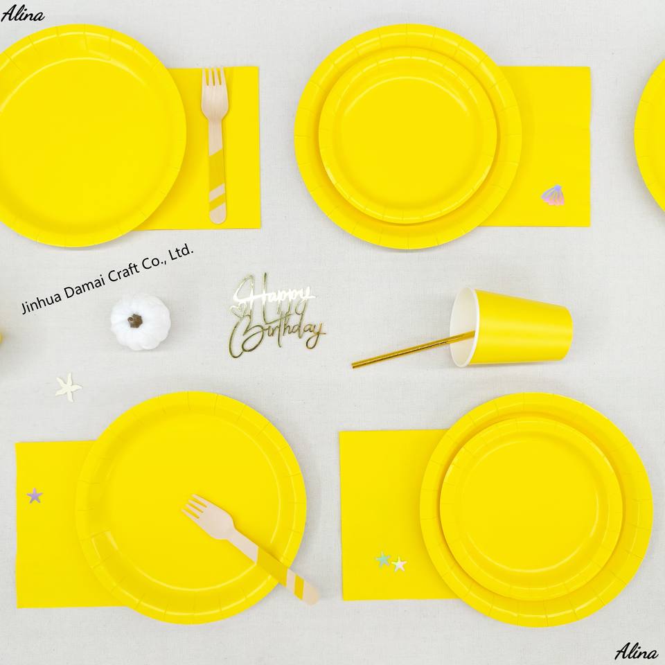 ชุดภาชนะใช้แล้วทิ้งสีเหลืองเรียบง่าย DAMAI สำหรับงานปาร์ตี้ งานวันเกิด กิจกรรมแคมป์ปิ้ง ของตกแต่งโต๊ะ กระดาษเช็ดปาก แก้ว จาน
