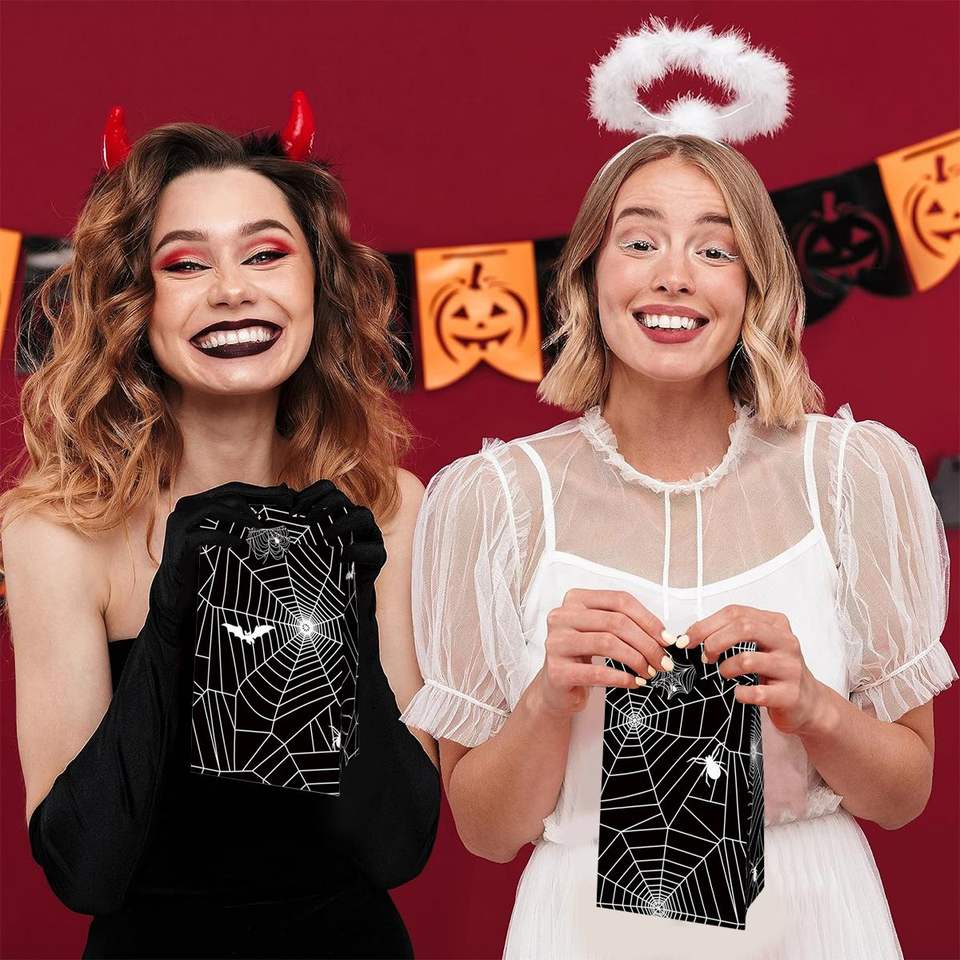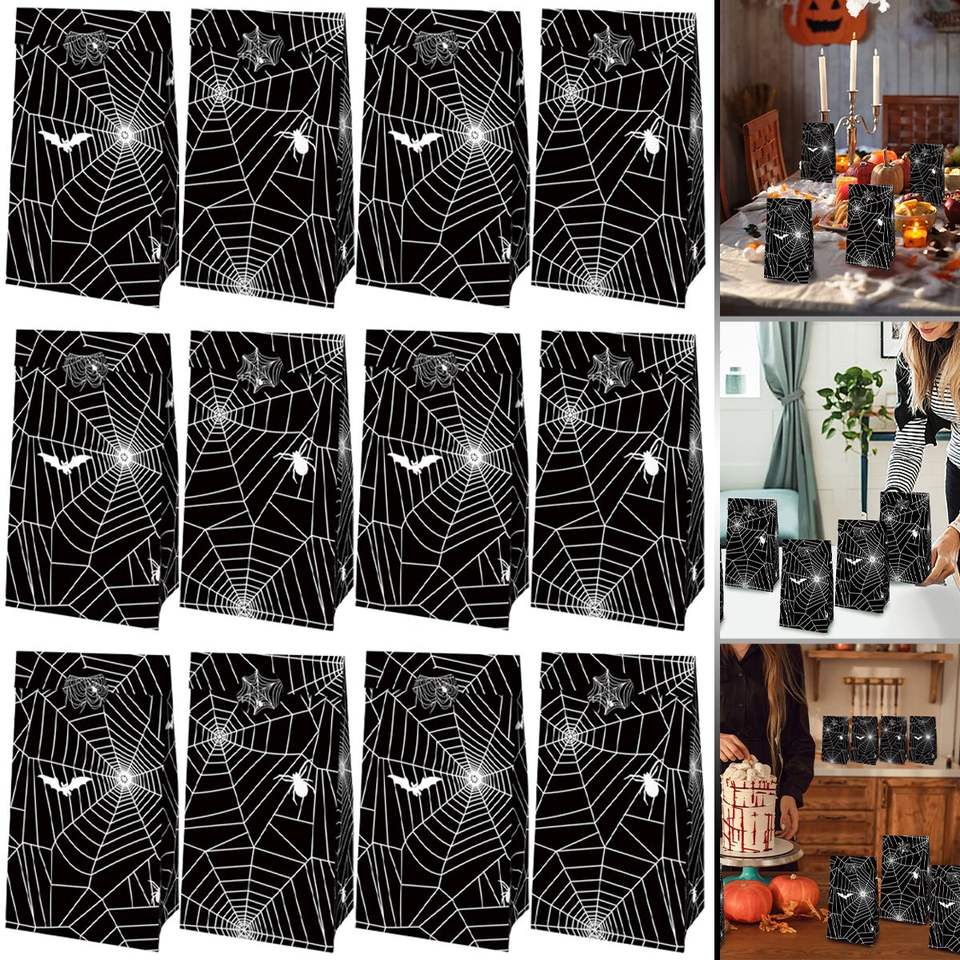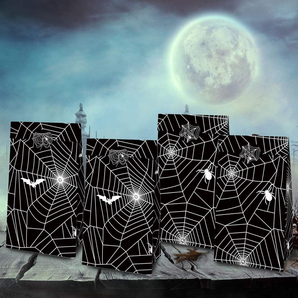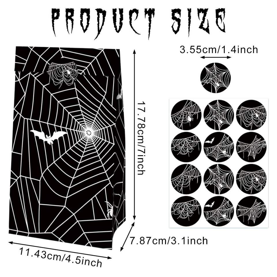 DB 12pcs Black Spider Web Gift Wrapping Bags 12pcs Sealing Stickers for Cookies Goodies Paper Treats Promotional Black Bags