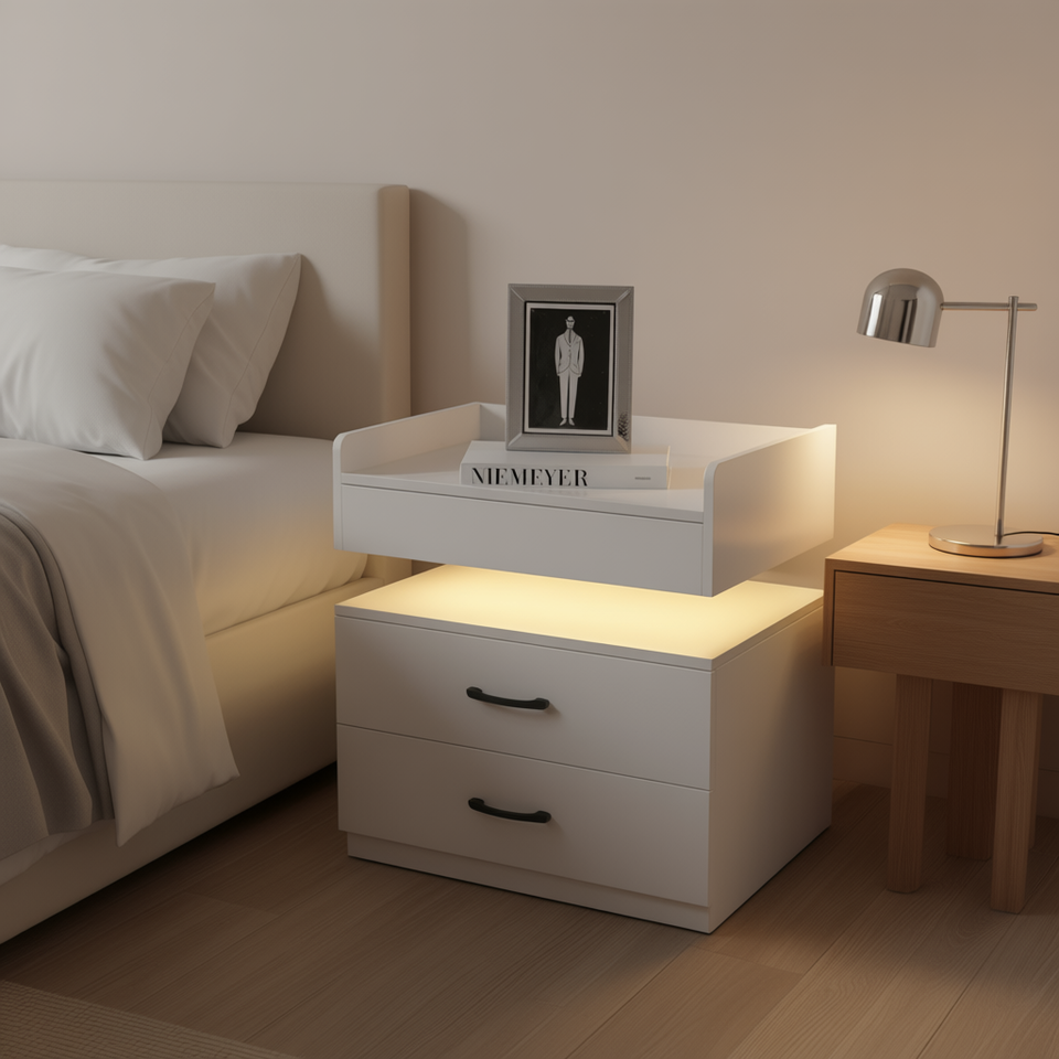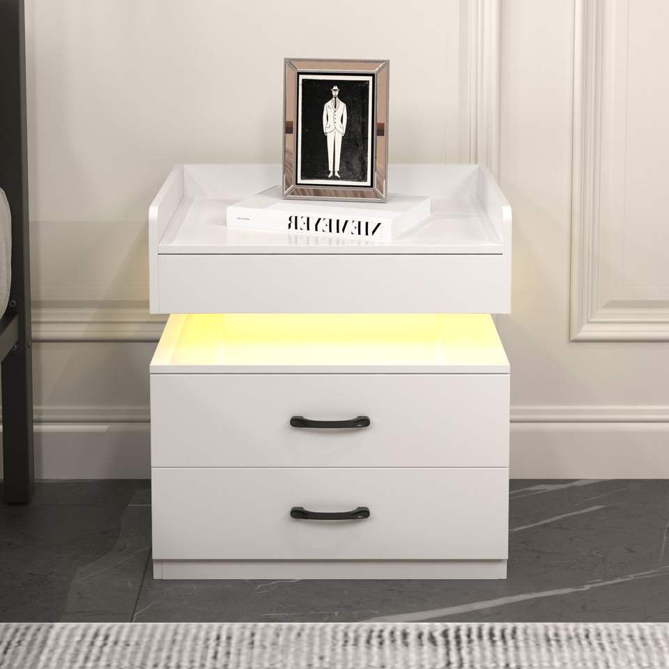 โต๊ะข้างเตียงพร้อมไฟ LED แบบแถบ 2 ลิ้นชัก เฟอร์นิเจอร์ห้องนอนทันสมัยสำหรับอพาร์ทเมนต์และบ้าน