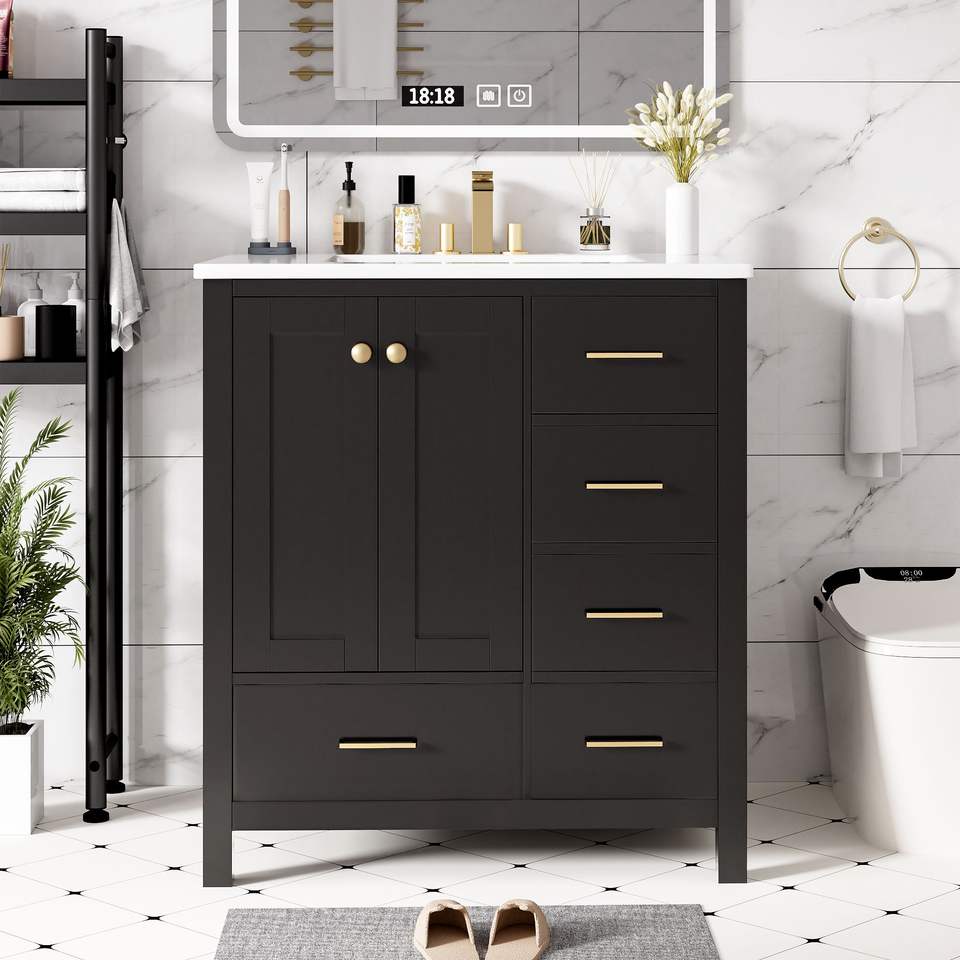 DB 30 ''ชุดโต๊ะเครื่องแป้งในห้องน้ำหรูหราพร้อมอ่างล้างหน้าเซรามิกกรอบไม้ตู้เก็บของโต๊ะเครื่องแป้งอิสระคอมโบ4