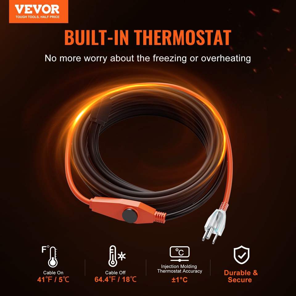 เทปความร้อน30FT dB สายเคเบิลความร้อนท่อ7W/FT พร้อมอุปกรณ์ทำความร้อนเทอร์โมสตัทในตัวสำหรับท่อ
