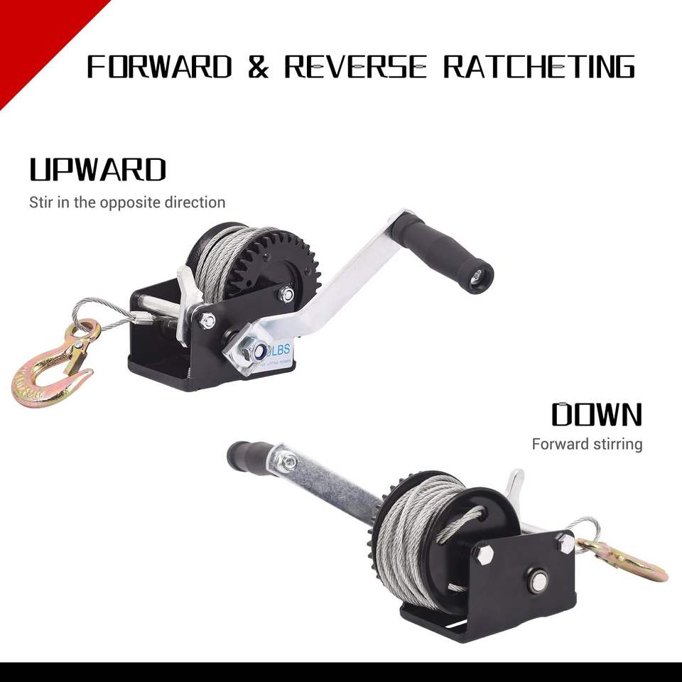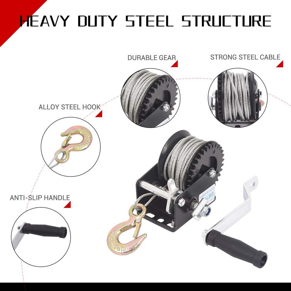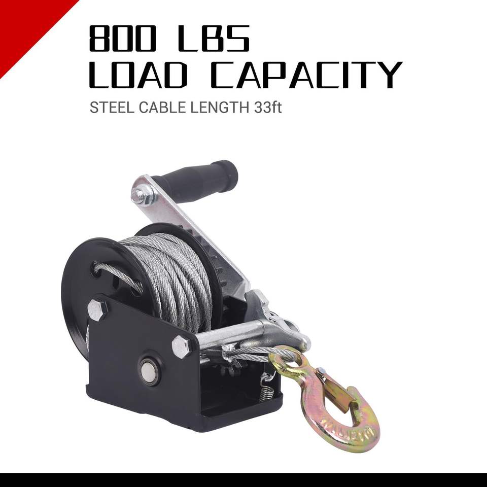 กว้านลากเรือแบบใช้มือ รับน้ำหนักได้ 800 ปอนด์ พร้อมสายเคเบิลเหล็กยาว 33 ฟุต พร้อมถุงมือ