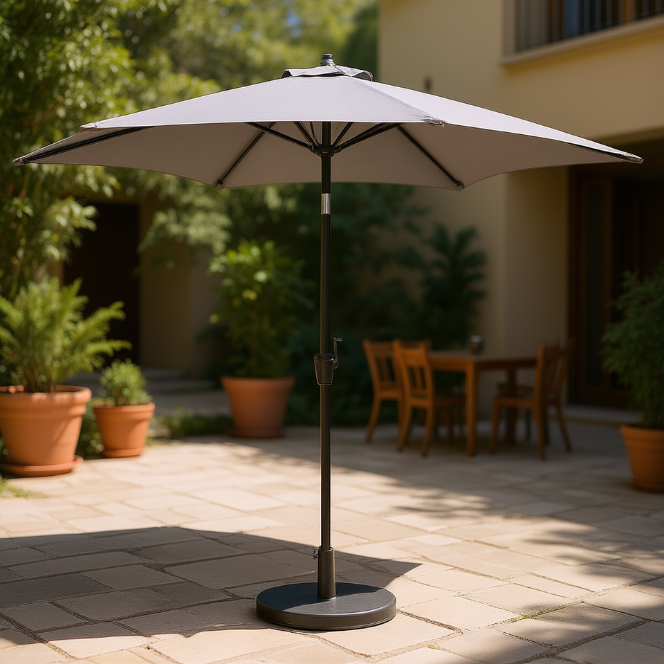 ร่มสนามอลูมิเนียมสีเทาขนาด 9 ฟุต พร้อมระบบยกด้วยมือและปรับเอียงได้ สำหรับใช้กันแดดกลางแจ้งในสวน