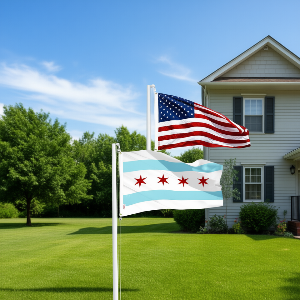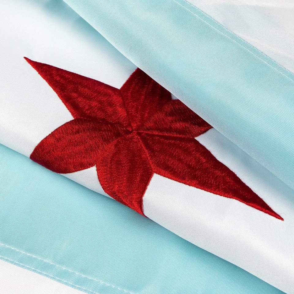 ธงชาติอเมริกาและชิคาโก ขนาด 2x3 ฟุต ผลิตจากโพลีเอสเตอร์ ปักลาย พร้อมห่วงทองเหลือง สำหรับใช้ภายในและภายนอกอาคาร