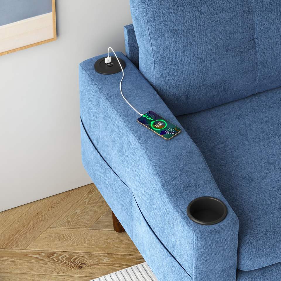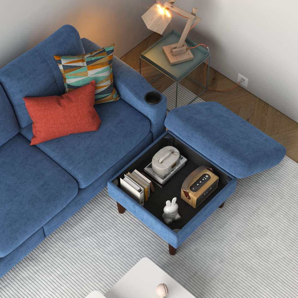 โซฟารูปตัวแอลแปลงสภาพสีน้ำเงินพร้อมตู้เก็บของที่วางเท้าขยายได้สำหรับห้องนั่งเล่นความสบาย