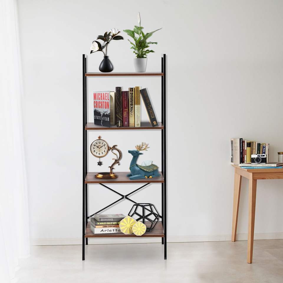 ชั้นหนังสือเหล็กและไม้สี่ชั้นการออกแบบ MDF ที่เรียบง่ายและสง่างามสำหรับห้องนั่งเล่นสำนักงานที่บ้านหรือที่จัดเก็บหนังสือการประชุมเชิงปฏิบัติการ