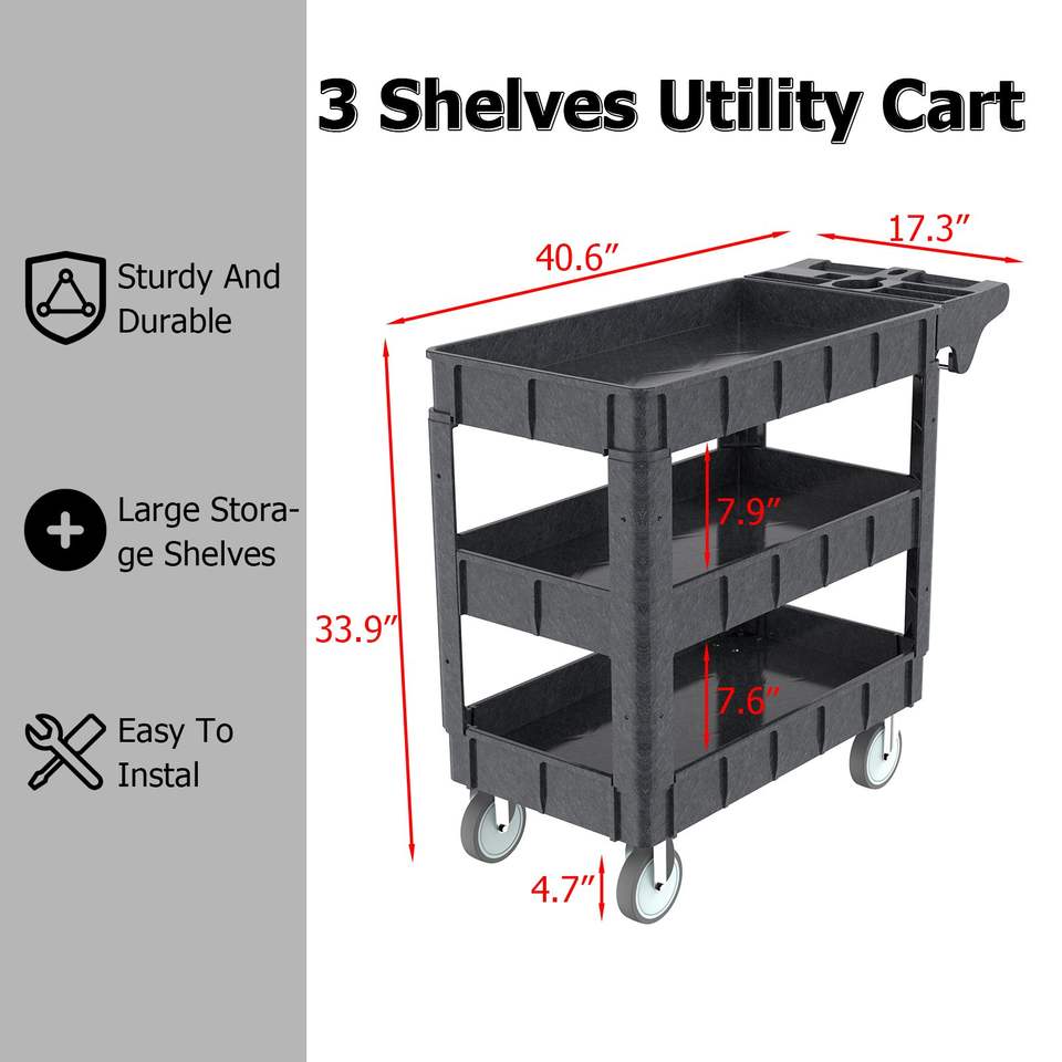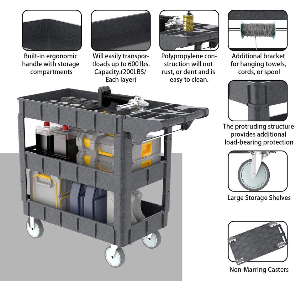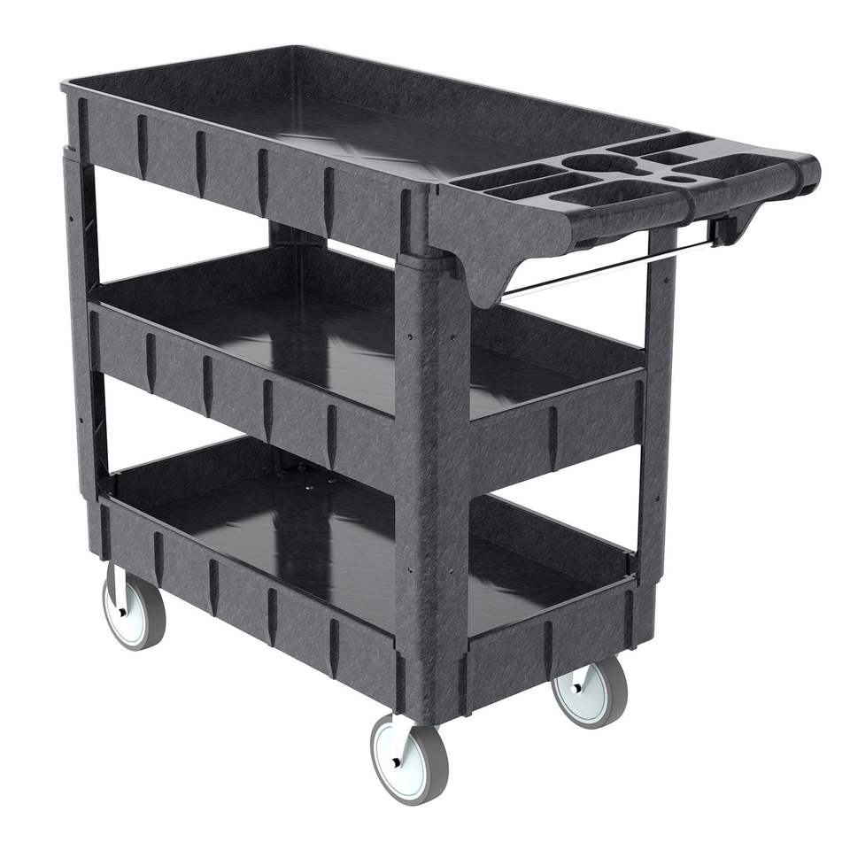 รถเข็นอเนกประสงค์พลาสติก 3 ชั้น DB Heavy Duty รับน้ำหนักได้ 600 ปอนด์ พร้อมที่จับตามหลักสรีรศาสตร์ สำหรับใช้ในโรงรถ/บริการ