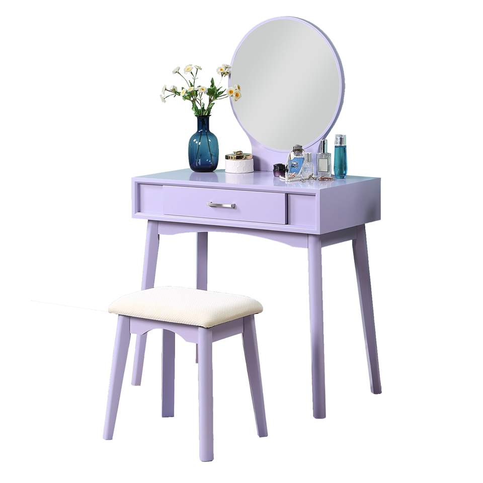 DB Maly ชุดโต๊ะเครื่องแป้งและเก้าอี้ไม้สไตล์ร่วมสมัยสีม่วงพร้อมกระจกส่องสว่างสำหรับโต๊ะเครื่องแป้งและโต๊ะเครื่องแป้ง