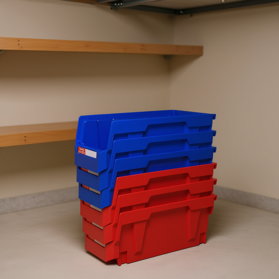 กล่องเก็บของแบบซ้อนได้ Db Wholesale ขนาด 11x5x5 นิ้ว ผลิตจากพลาสติก สีแดงน้ำเงิน สำหรับเก็บของในโรงรถ