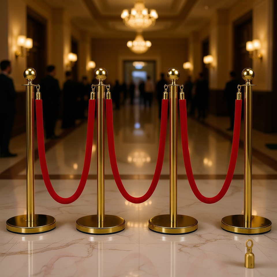 DB Wholesale 4Pcs Gold Steel Stanchion Posts 38 Inch Red Velvet Rope Crowd Control Queue Line Barriers for Parties