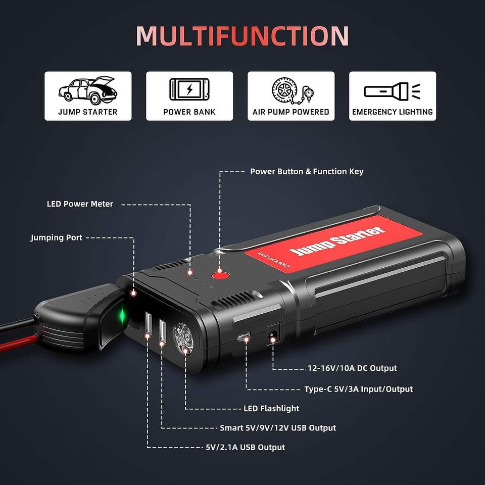 เครื่องจั๊มพ์สตาร์ท DBPOWER 2500A 21800mAh แบบพกพา 12V สำหรับแบตเตอรี่รถยนต์ ใช้ได้กับเครื่องยนต์เบนซินและดีเซล