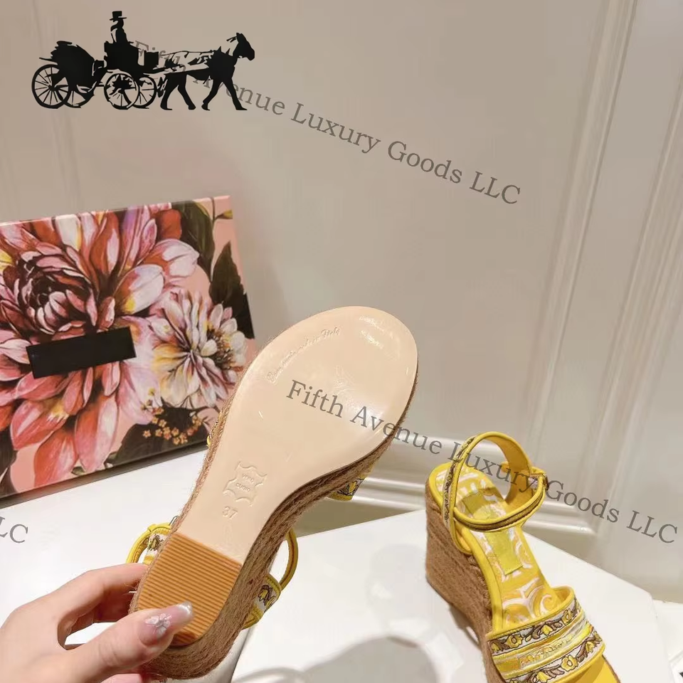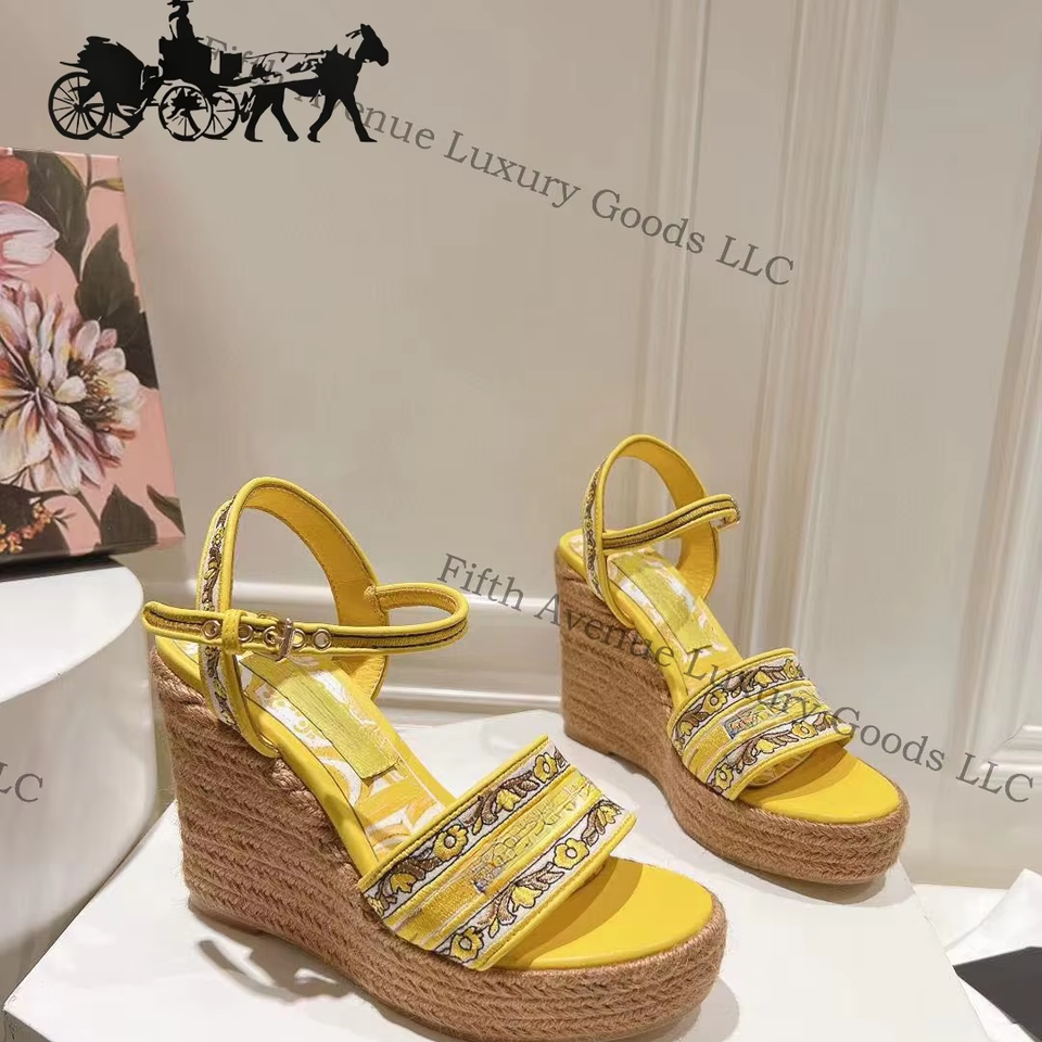 รองเท้าส้นสูงหนังหรูหรา DC Floral Collection รองเท้าส้นเข็มแบบสวมสำหรับผู้หญิง รองเท้าส้นตึกแบบมีพื้นรองเท้าเสริม วัสดุผ้าสเตรช