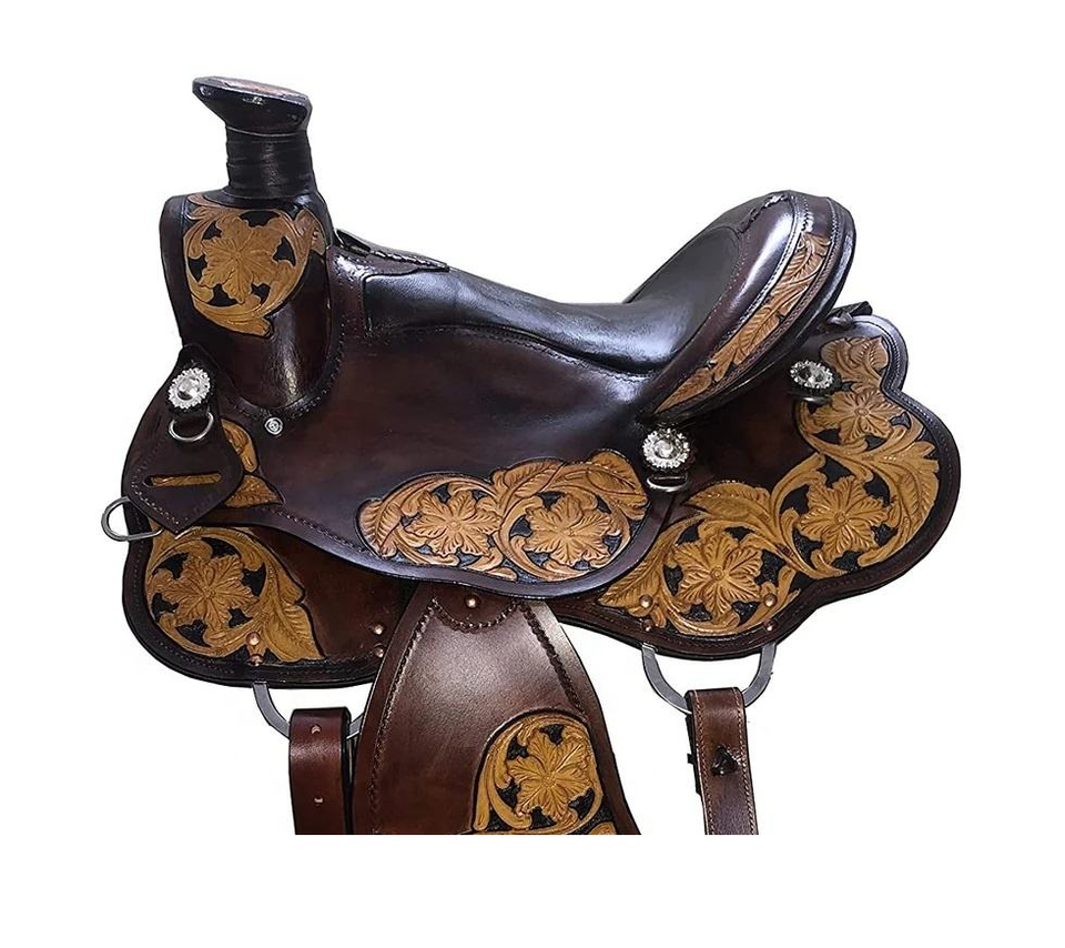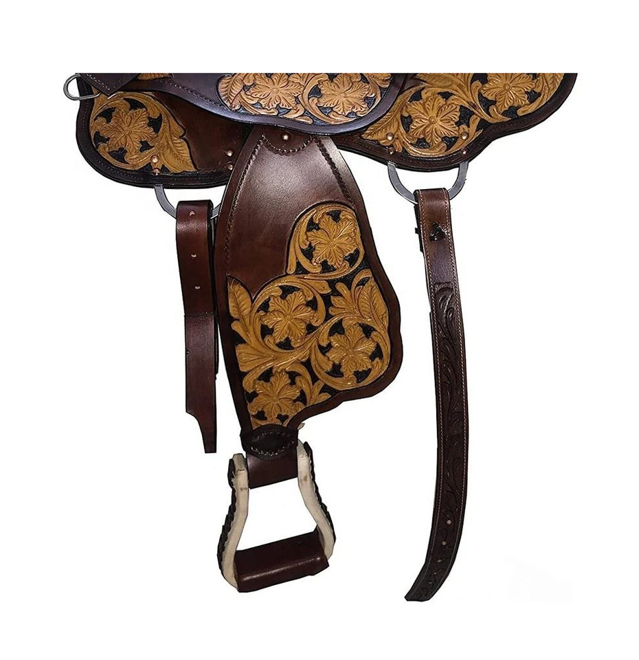 ชุดอุปกรณ์ขี่ม้าแบบตะวันตกสีน้ำตาลลายดอกไม้ของผู้ผลิตชาวอินเดีย ทำจากหนังแกะสลักลายด้วยมือ พร้อมอุปกรณ์เสริมสำหรับการขี่ม้าแบบโรปปิ้ง รวมถึงโครงไม้สำหรับม้า