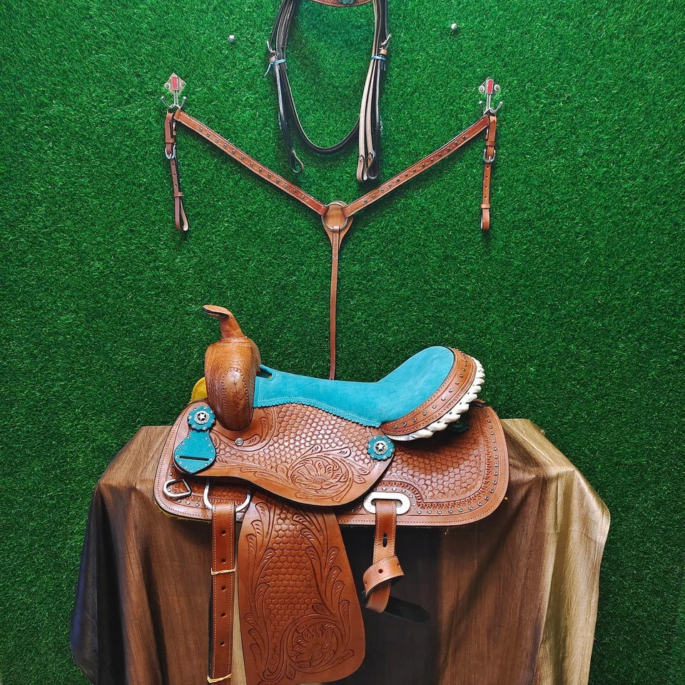 อานม้าหนังแท้ทรงบาร์เรลแบบตะวันตก ยี่ห้อ DD Tan ประดับตกแต่งด้วย Conchos สีเทอร์ควอยซ์ ขนเฟอร์เทียม โครงเหล็กกล้าไร้สนิม เบาะหนังเรียบบุฟองน้ำ